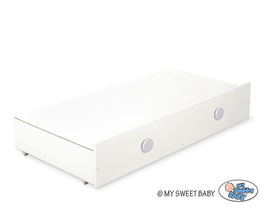 Een lade voor een ledikant van 120x60 cm met decoratieve, handgemaakte handvaten. Biedt meer ruimte voor beddengoed, speelgoed en andere benodigdheden.