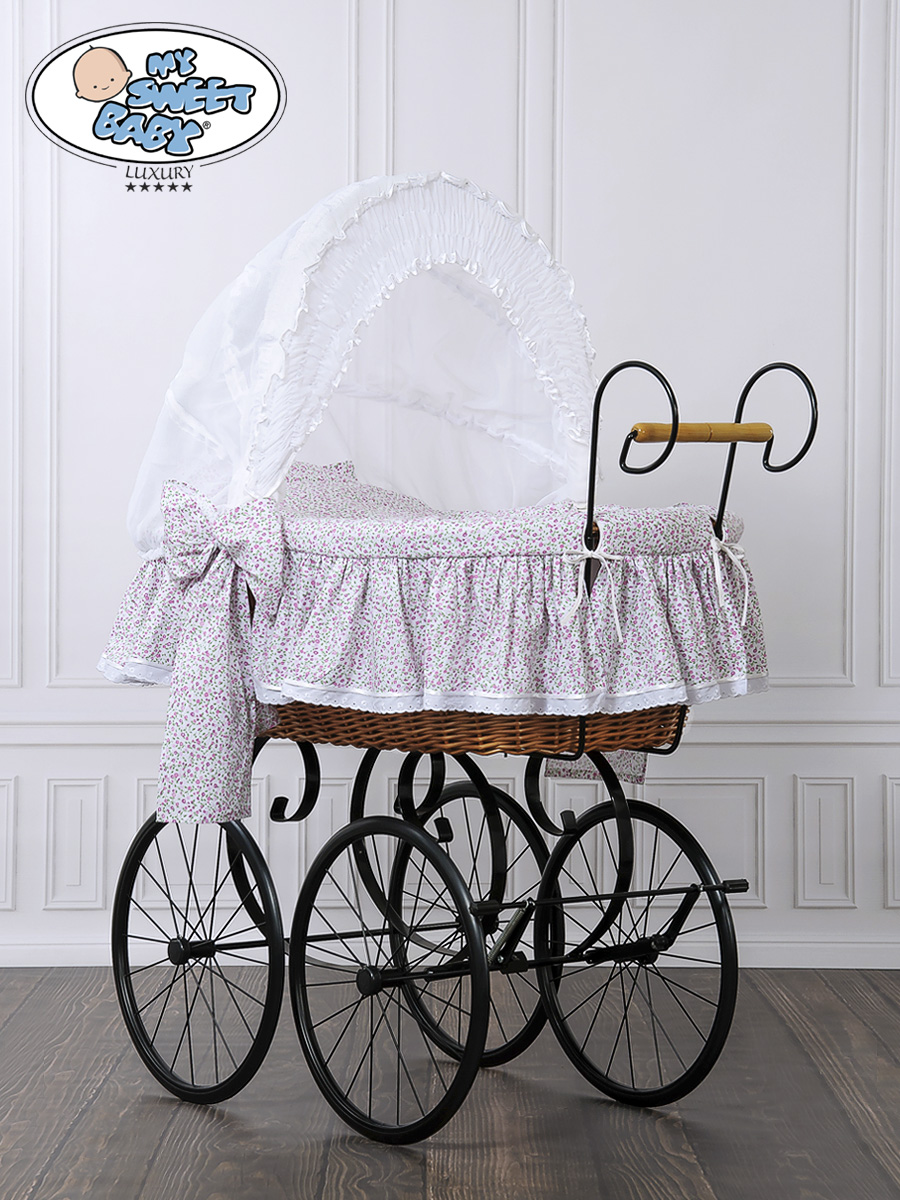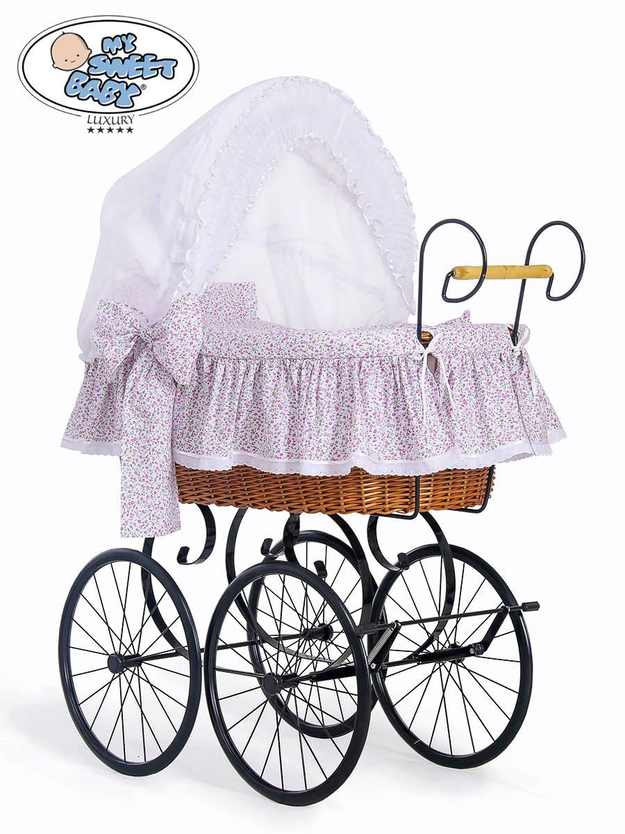 Retro babymand op een metalen, met de hand gebogen onderstel, met grote wielen met rubberen banden.