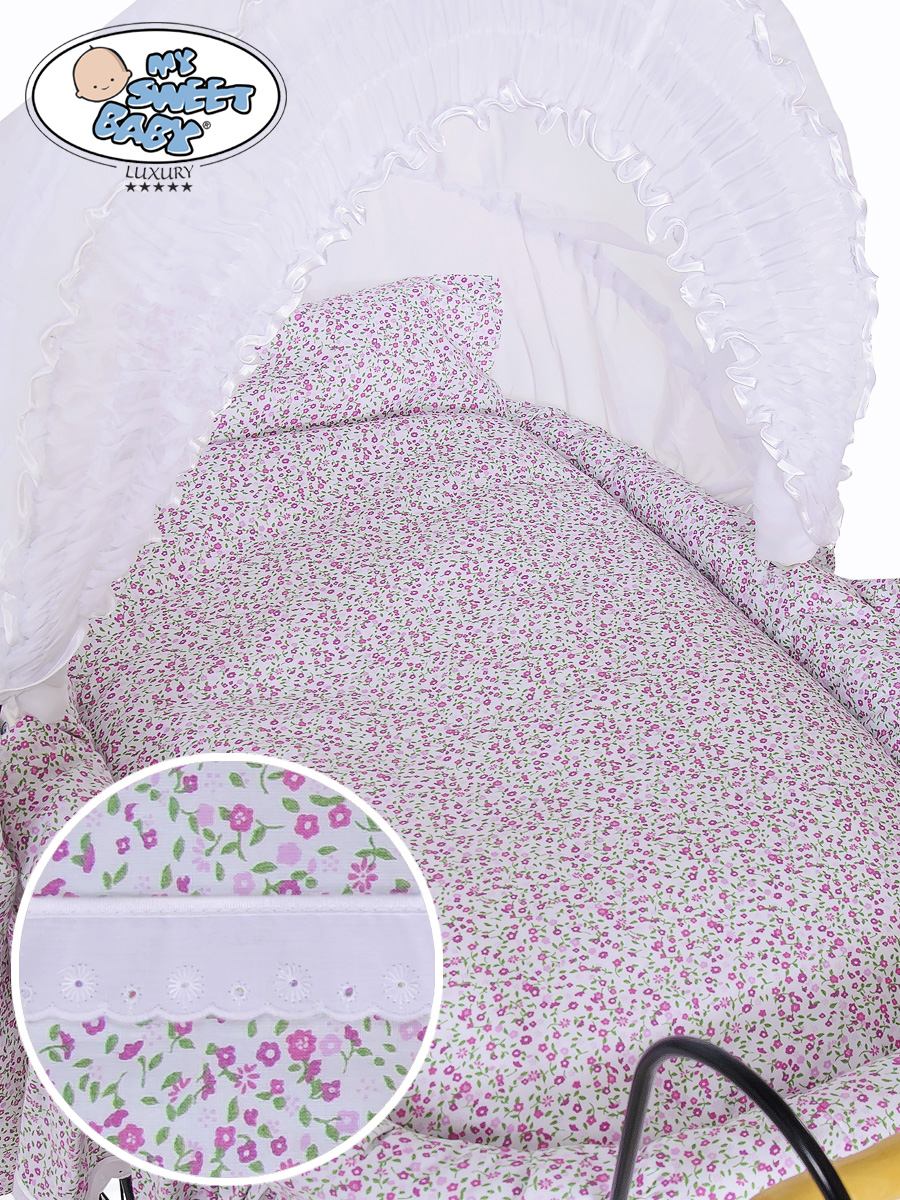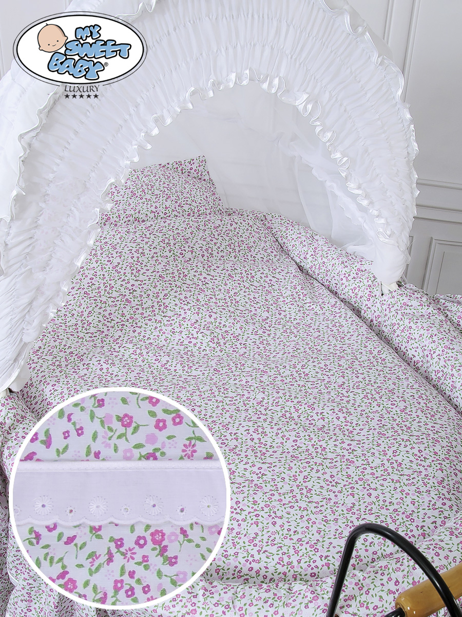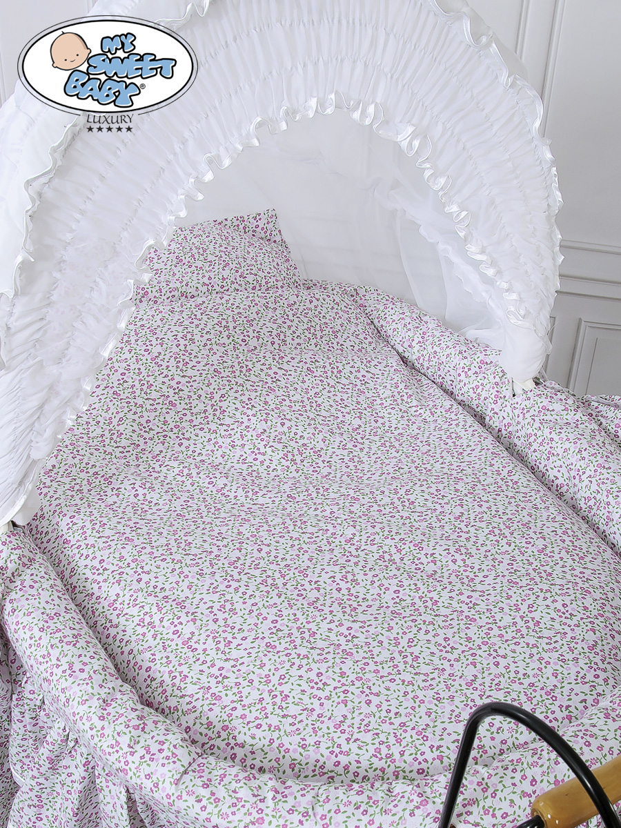 → overtrek met een ingenaaide, zachte vulling, kap en hoes, hoofdkussen en hoes (vulling: buitenstof in 100% katoen, vulling in 100% polyester), dekbedovertrek en bedsprei. Allemaal van 100% katoen.