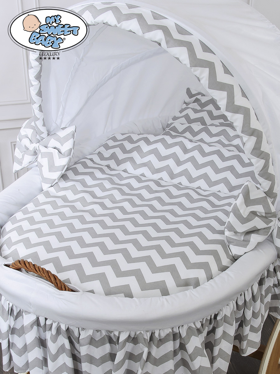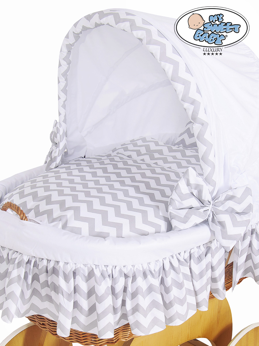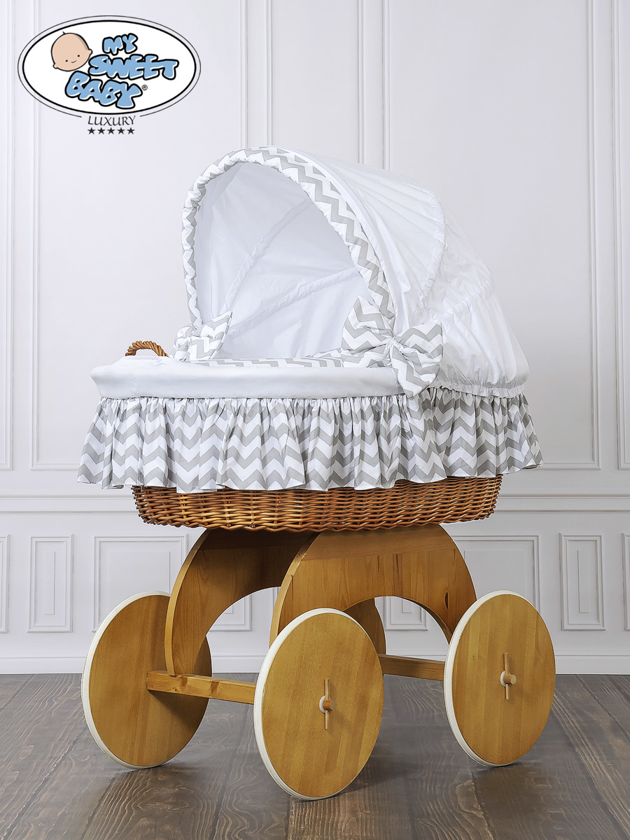 Kleinbaby.nl » Babywiege » Rieten Wieg My Sweet Baby Luxury » Rieten Wiegen met Kap » Rieten Wiegen met Kap » Babywieg op Wielen / Rieten en Houten Wieg - met Kap - Beddengoed Wit Grijs Hanna