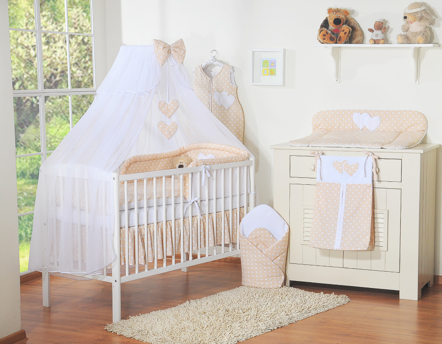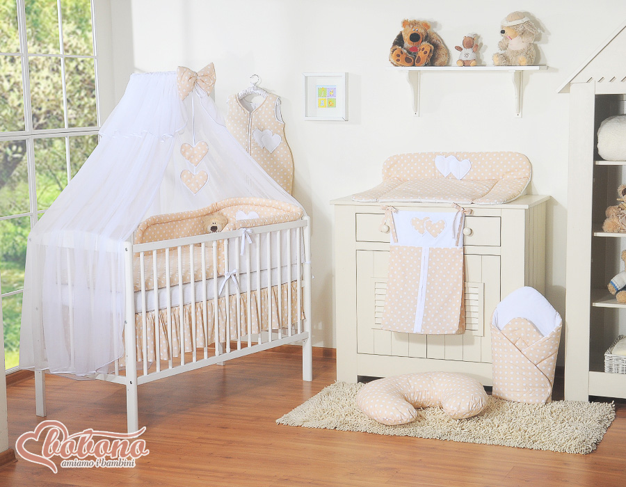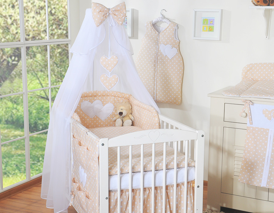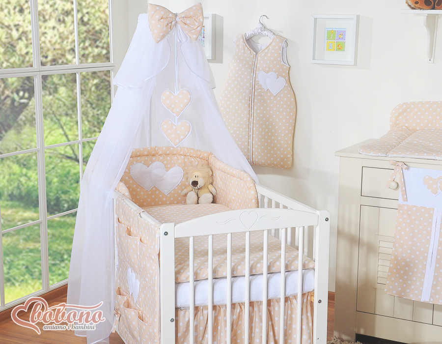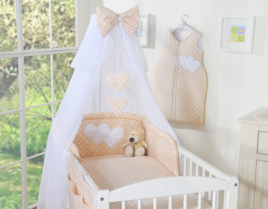 Kleinbaby.nl » Beddengoed voor Ledikant » Beddengoed Set Collectie Harten » 120cm ledikant Beddengoed Set » Beddengoed 5 st met Klamboe Harten » Beddengoed voor Babybed 5 st met Klamboe - Harten Beige Polkaprikker