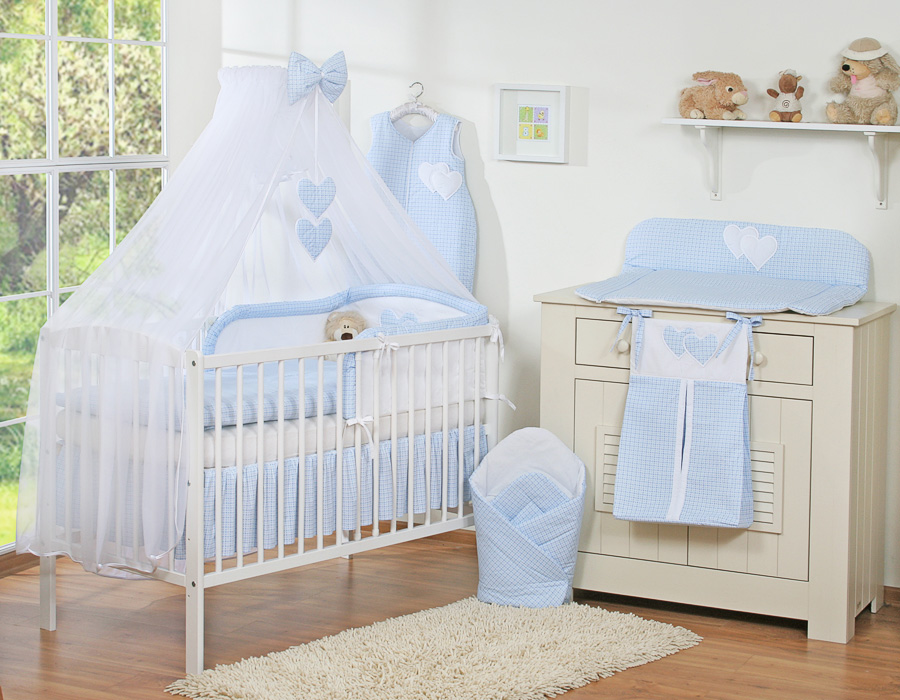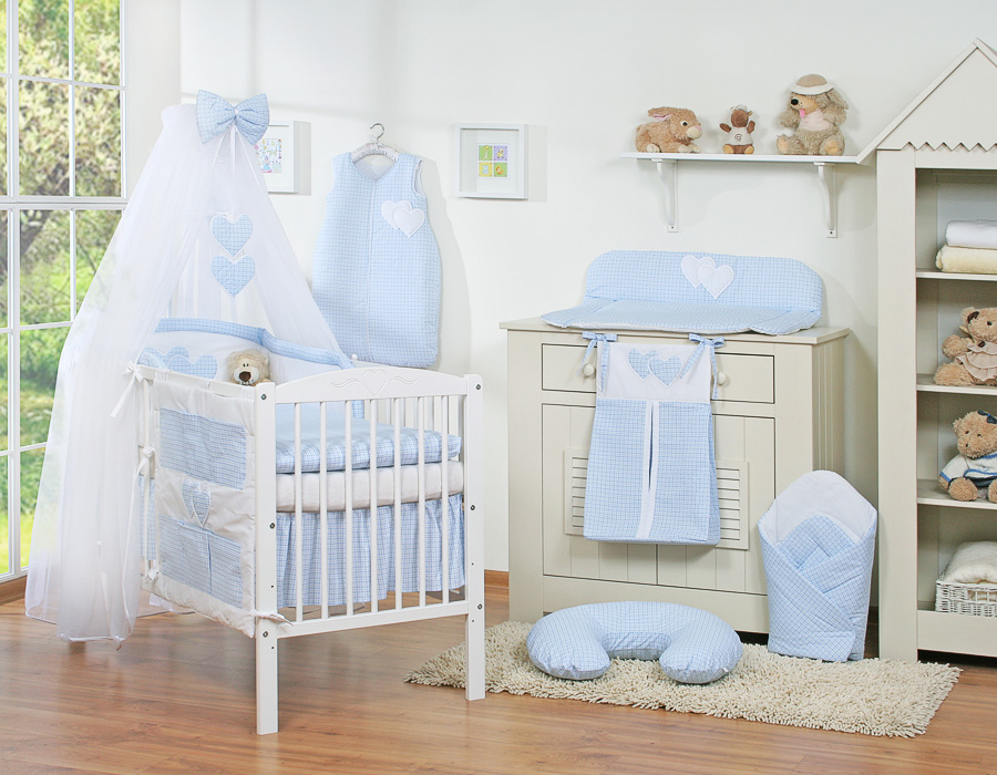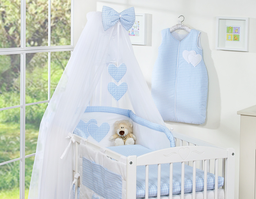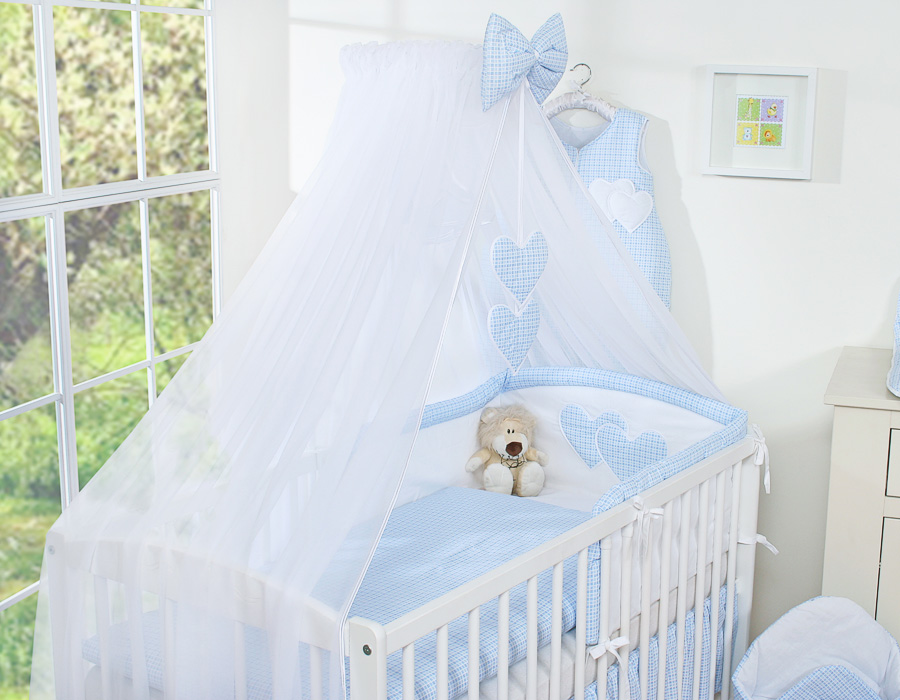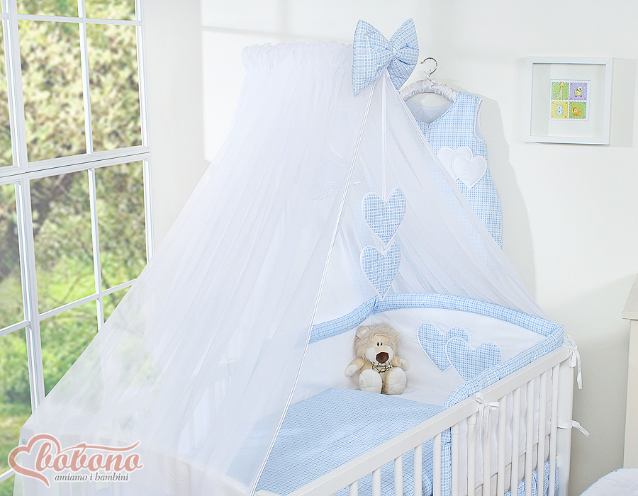 Kleinbaby.nl » Beddengoed voor Ledikant » Beddengoed Set Collectie Harten » 120cm ledikant Beddengoed Set » Beddengoed 5 st met Klamboe Harten » Beddengoed voor Babybed 5 st met Klamboe - Harten Blauw Geruit