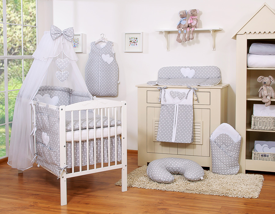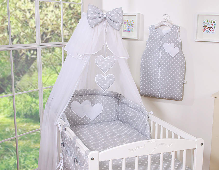 Kleinbaby.nl » Beddengoed voor Ledikant » Beddengoed Set Collectie Harten » 120cm ledikant Beddengoed Set » Beddengoed 7 st met Klamboe - Harten » Beddengoed voor Babybed 7 st met Hemel Klamboe - Harten Grijs Polkaprikker