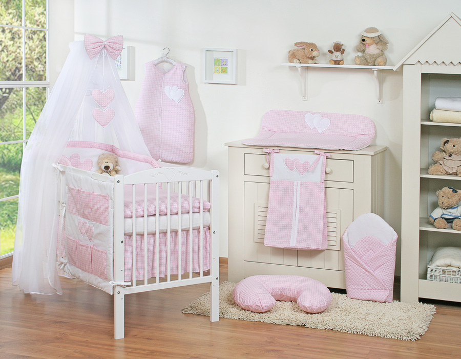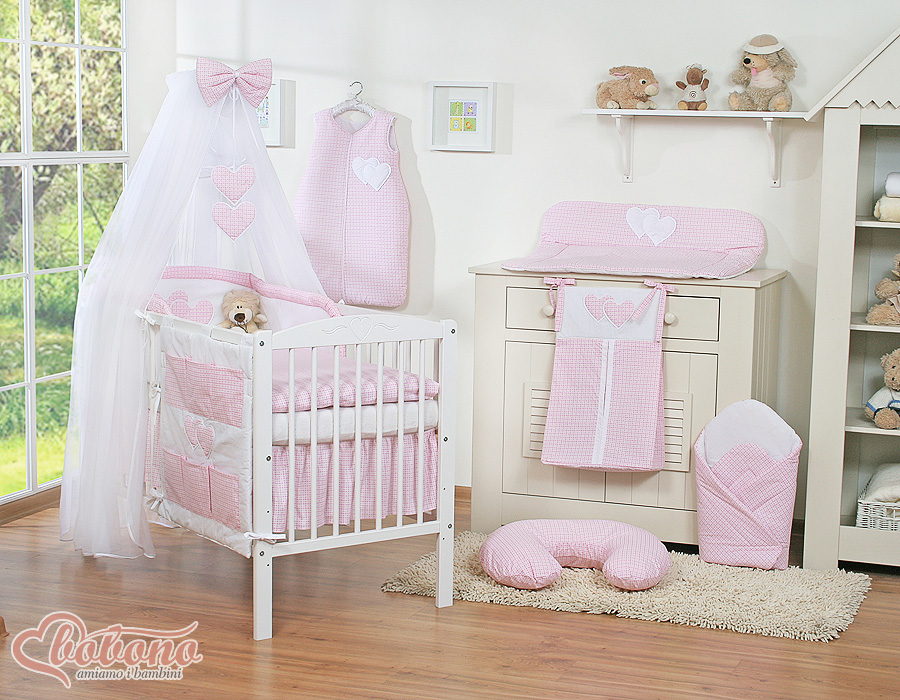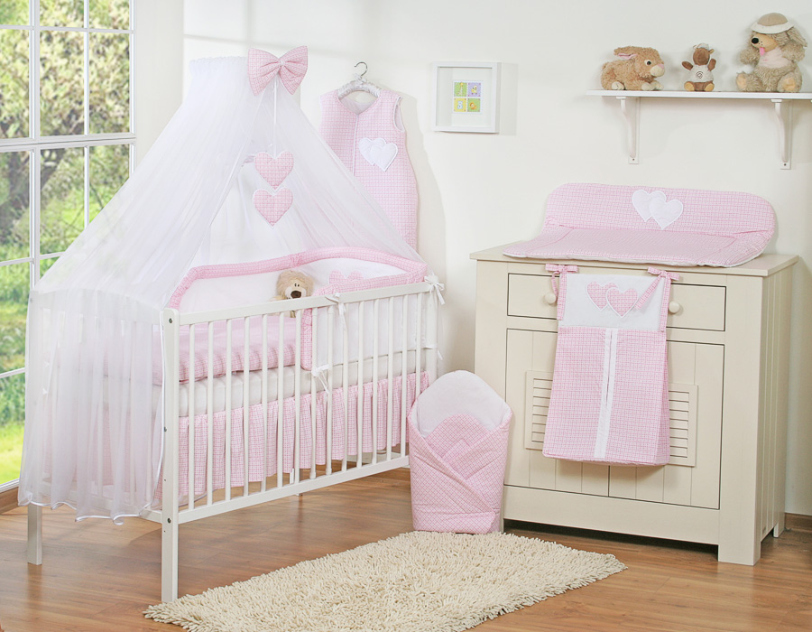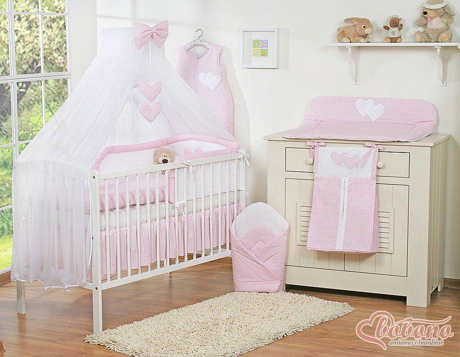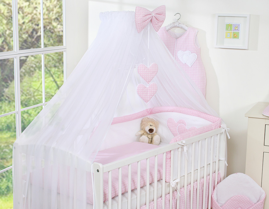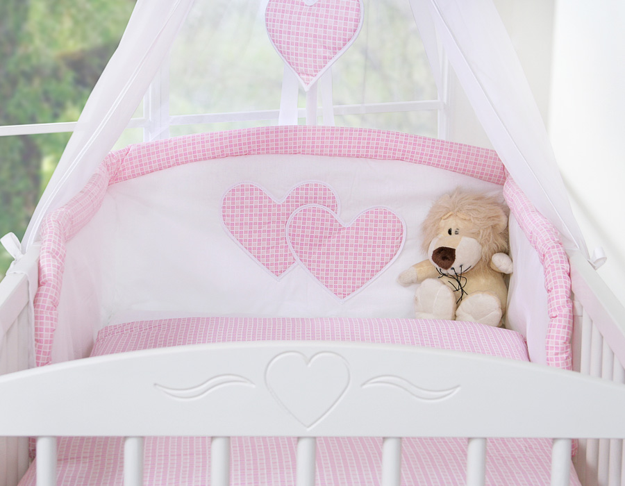 Kleinbaby.nl » Beddengoed voor Ledikant » Beddengoed Set Collectie Harten » 120cm ledikant Beddengoed Set » Beddengoed 5 st met Klamboe Harten » Beddengoed voor Kinderbed 5 st met Klamboe - Harten Roze Geruit