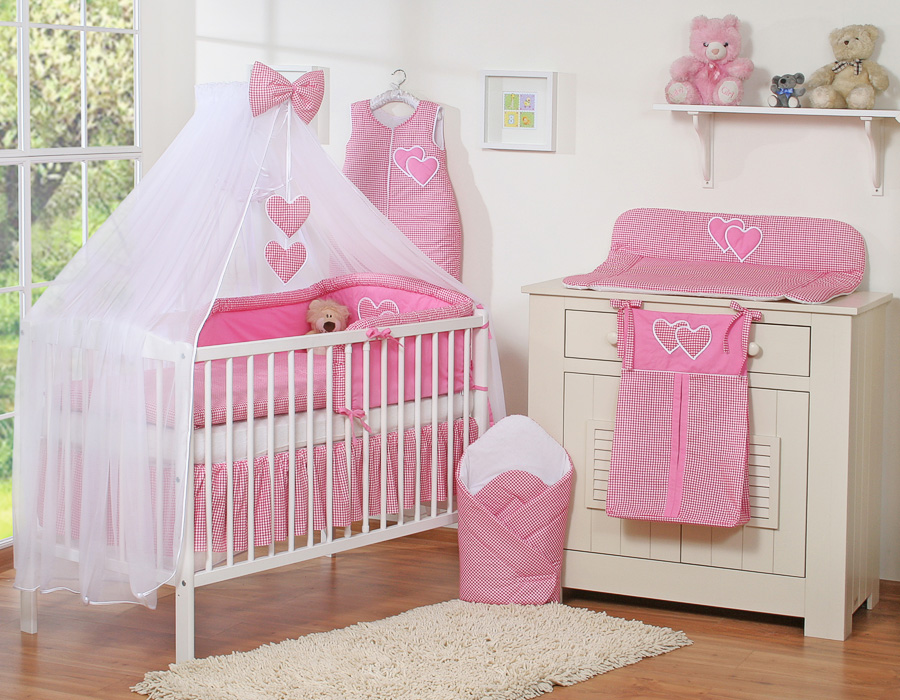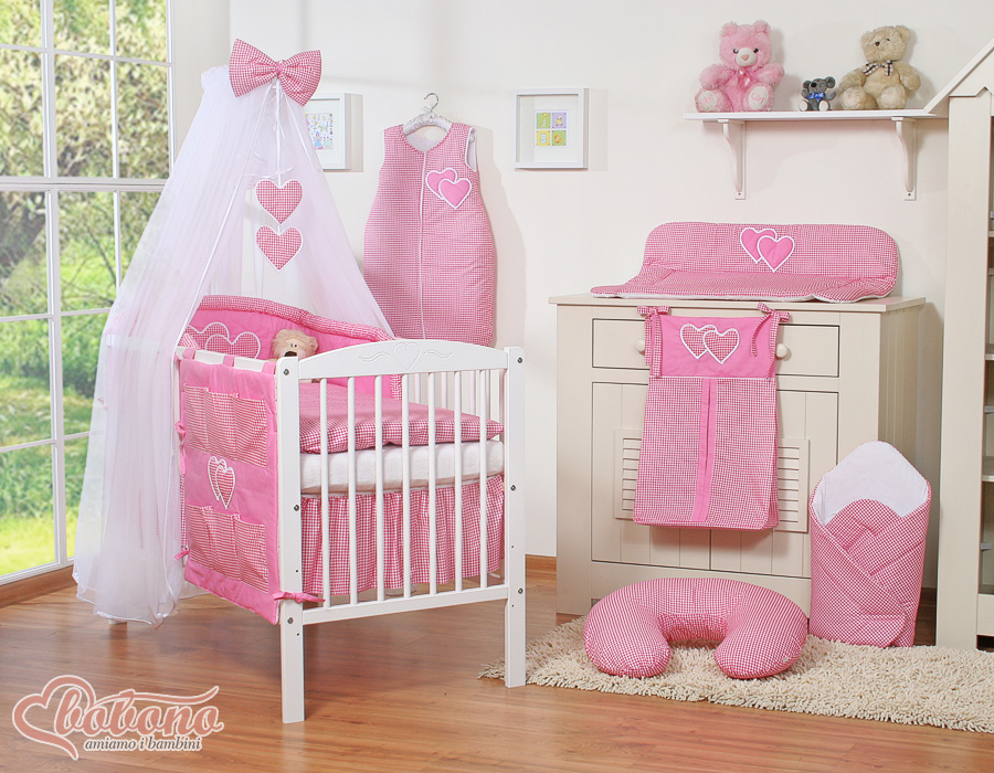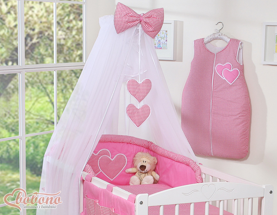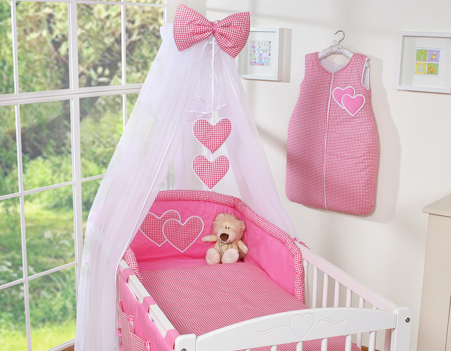 Kleinbaby.nl » Beddengoed voor Ledikant » Beddengoed Set Collectie Harten » 120cm ledikant Beddengoed Set » Beddengoed 5 st met Klamboe Harten » Beddengoed voor Ledikant 5 st met Klamboe - Harten Roze Geruit