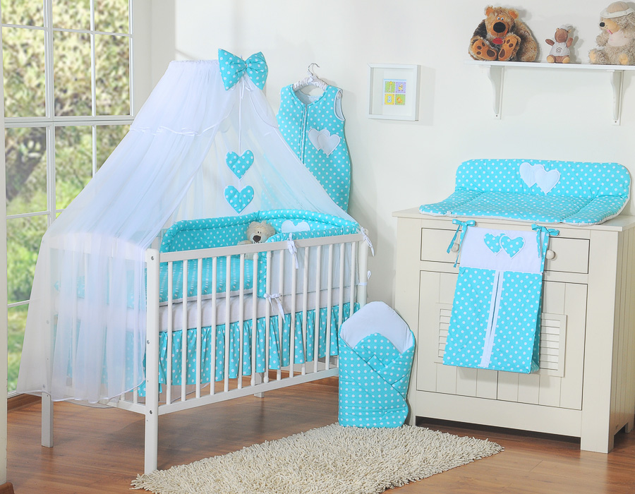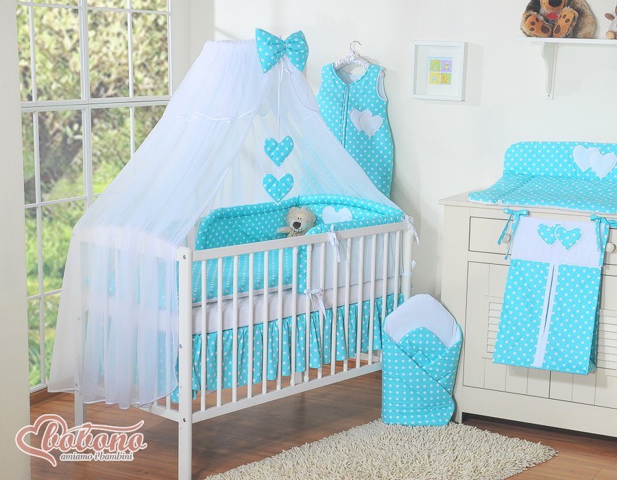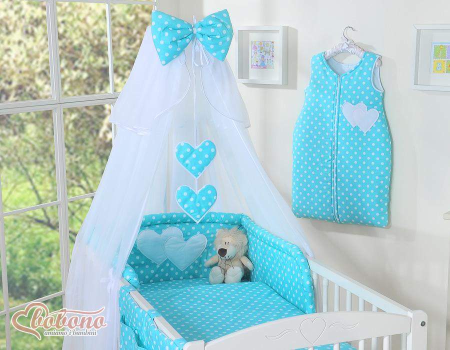Kleinbaby.nl » Beddengoed voor Ledikant » Beddengoed Set Collectie Harten » 120cm ledikant Beddengoed Set » Beddengoed 5 st met Klamboe Harten » Beddengoed voor Ledikant 5 st met Klamboe - Harten Turkoois Polkaprikker