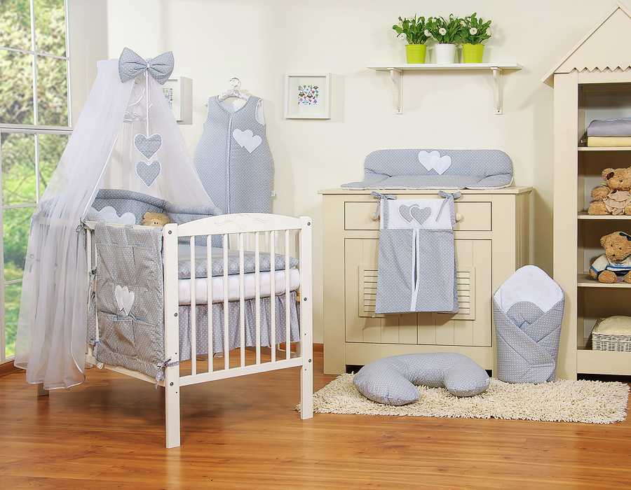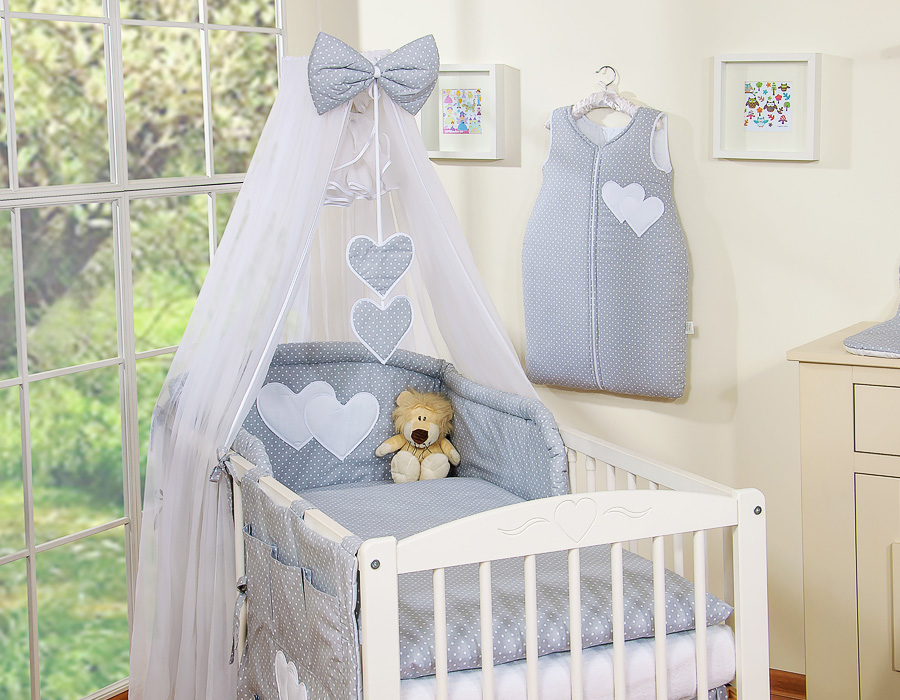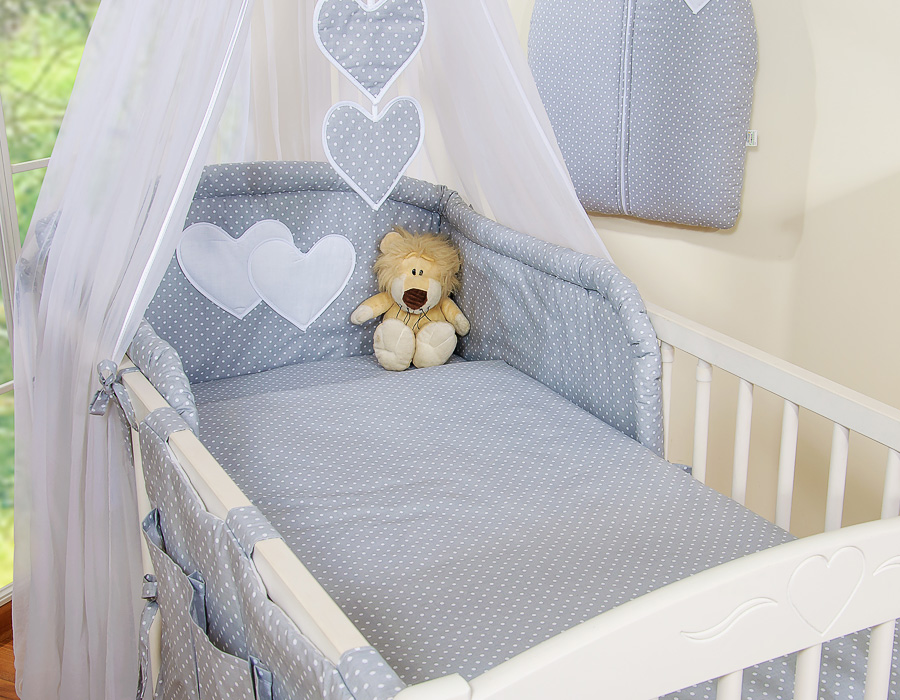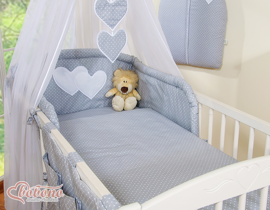 Kleinbaby.nl » Beddengoed voor Ledikant » Beddengoed Set Collectie Harten » 120cm ledikant Beddengoed Set » Beddengoed 7 st met Klamboe - Harten » Beddengoed voor Ledikant 7 st met Hemel Klamboe - Harten Grijs Polkaprikker