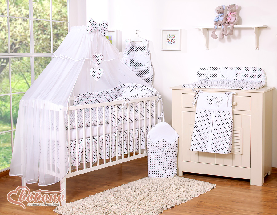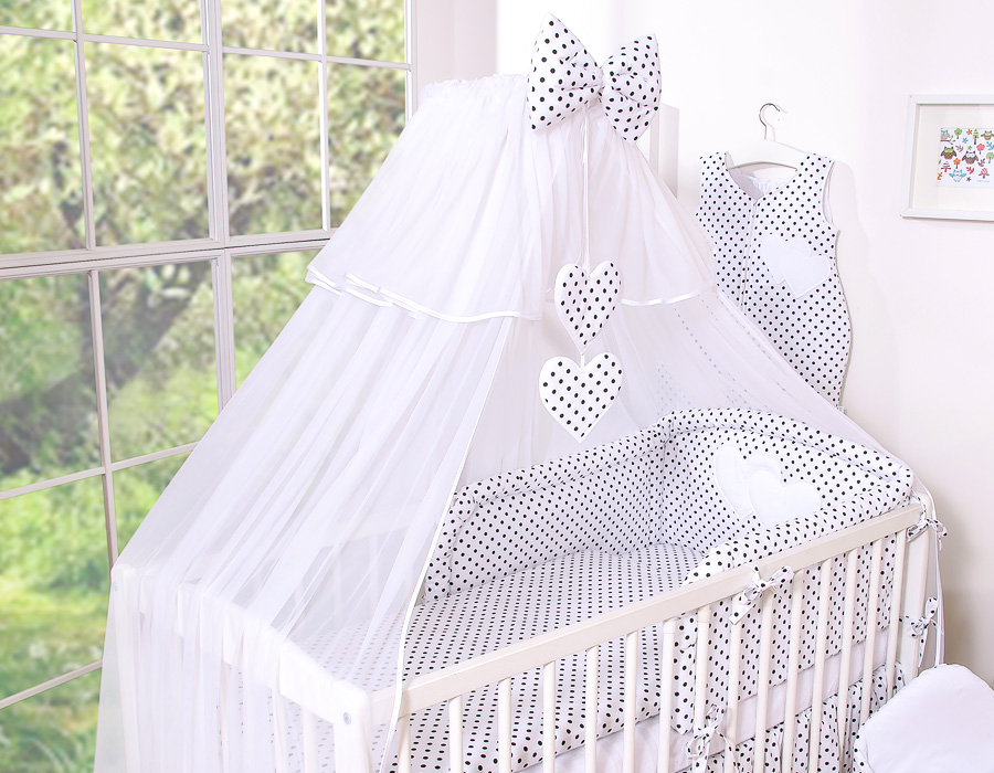 Kleinbaby.nl » Beddengoed voor Ledikant » Beddengoed Set Collectie Harten » 120cm ledikant Beddengoed Set » Beddengoed 7 st met Klamboe - Harten » Beddengoed voor Ledikant 7 st met Hemel Klamboe - Harten Zwart Polkaprikker