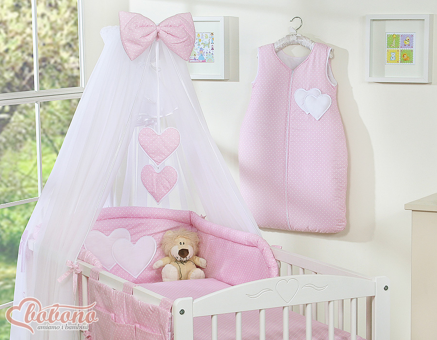 Kleinbaby.nl » Beddengoed voor Ledikant » Beddengoed Set Collectie Harten » 140cm ledikant Beddengoed Set » Beddengoed 11 st met Klamboe - Harten » Beddengoed voor Ledikant met Klamboe Bedomrander - Harten Roze Polkaprikker