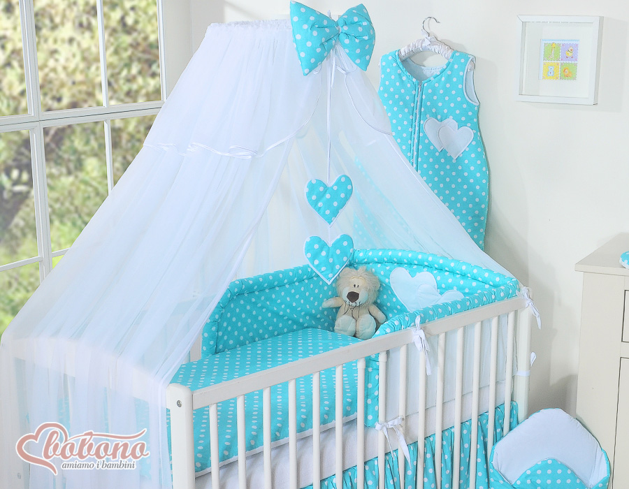 Kleinbaby.nl » Beddengoed voor Ledikant » Beddengoed Set Collectie Harten » 140cm ledikant Beddengoed Set » Beddengoed 11 st met Klamboe - Harten » Beddengoed voor Ledikant met Klamboe Bedomrander - Harten Turkoois Polkaprikker