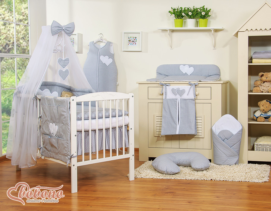 Kleinbaby.nl » Beddengoed voor Ledikant » Beddengoed Set Collectie Harten » 120cm ledikant Beddengoed Set » Beddengoed 11 st met Klamboe - Harten » Beddengoedset voor Ledikant 11 st met Klamboe - Harten Grijs Polkaprikker