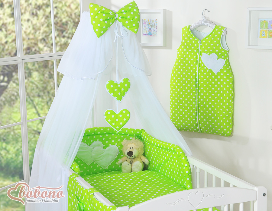 Kleinbaby.nl » Beddengoed voor Ledikant » Beddengoed Set Collectie Harten » 120cm ledikant Beddengoed Set » Beddengoed 11 st met Klamboe - Harten » Beddengoedset voor Ledikant 11 st met Klamboe - Harten Groen Polkaprikker