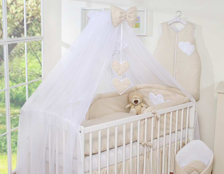 Kleinbaby.nl » Beddengoed voor Ledikant » Beddengoed Set Collectie Harten » 120cm ledikant Beddengoed Set » Beddengoed 7 st met Klamboe - Harten » Beddengoedset voor Ledikant 7 st met Muskietennet met sluierstang - Harten Beige Polkaprikker
