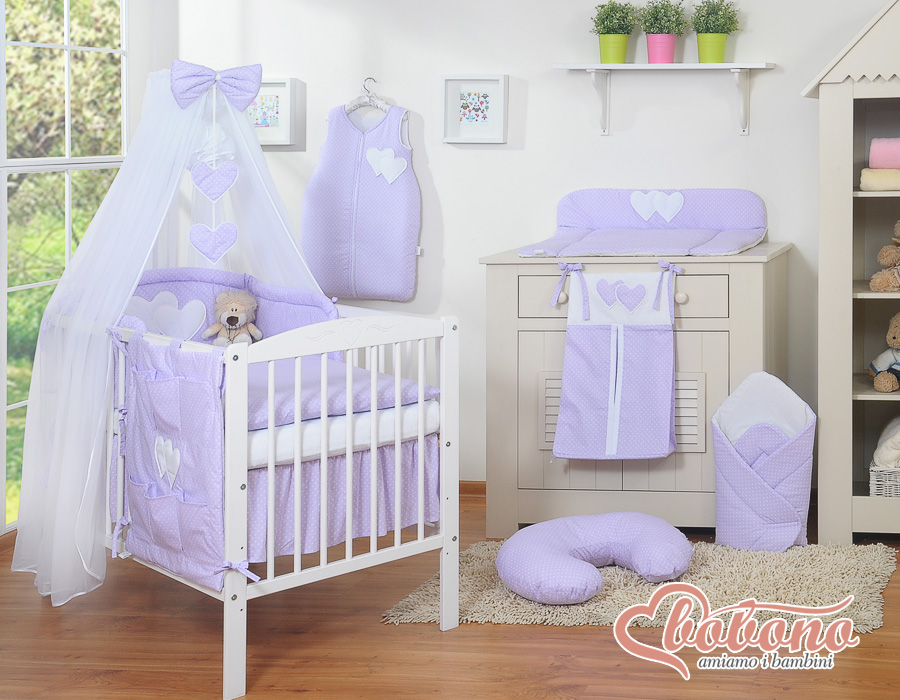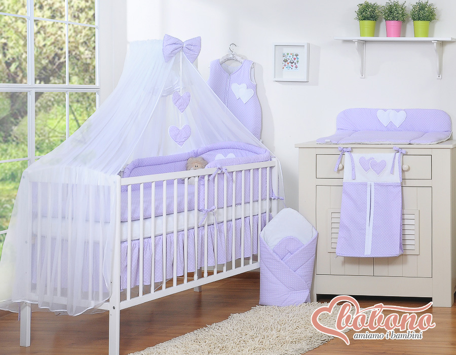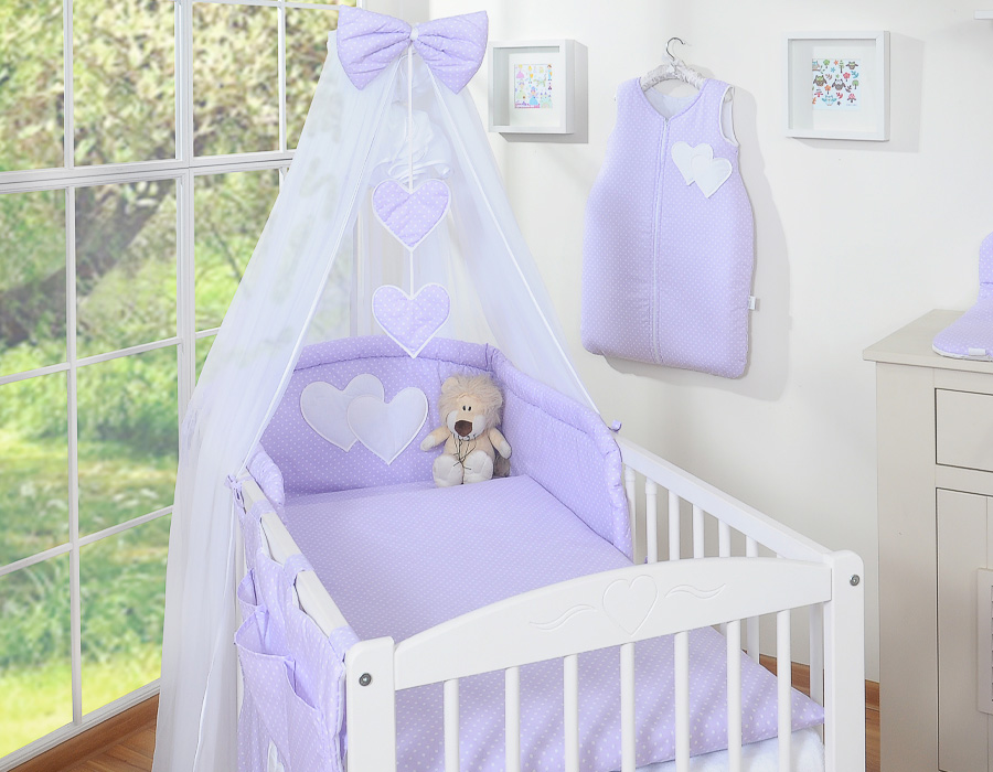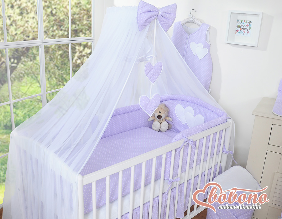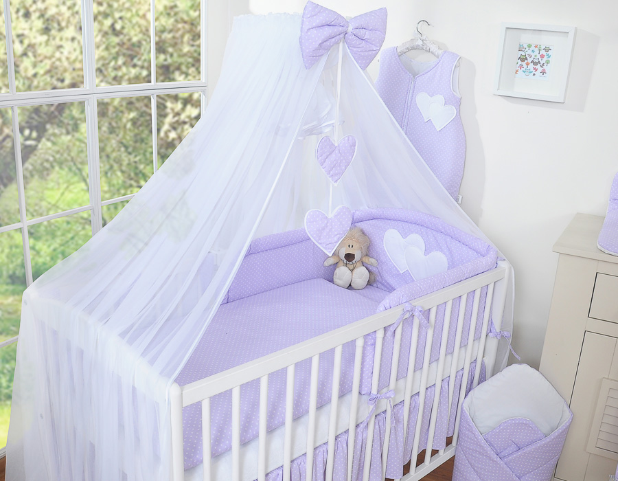 Kleinbaby.nl » Beddengoed voor Ledikant » Beddengoed Set Collectie Harten » 120cm ledikant Beddengoed Set » Beddengoed 7 st met Klamboe - Harten » Beddengoedset voor Ledikant 7 st met Muskietennet met sluierstang - Harten Purper Polkaprikker