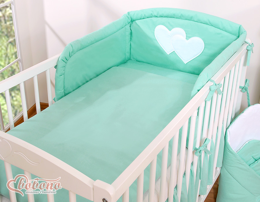Hoog, licht afgerond hoofdbord met decoratieve harten, mooi afgezet met satijnen biezen. Speciaal afgezette, versterkte en verdikte bovenrand voor nog meer zachtheid en veiligheid in het ledikant.