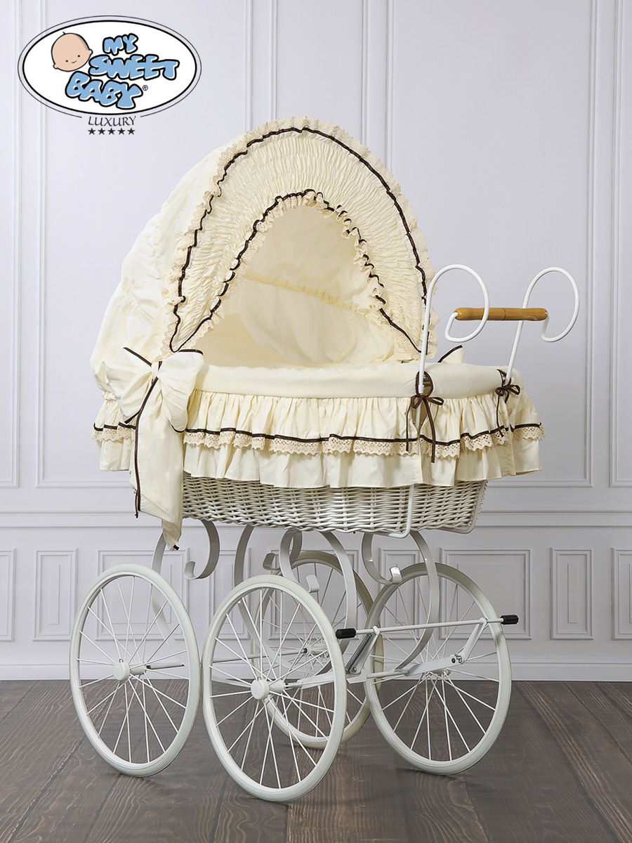 Retro babymand op een metalen, met de hand gebogen onderstel, met grote wielen met rubberen banden.
