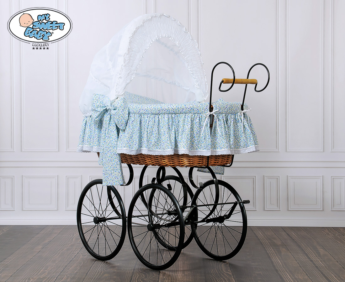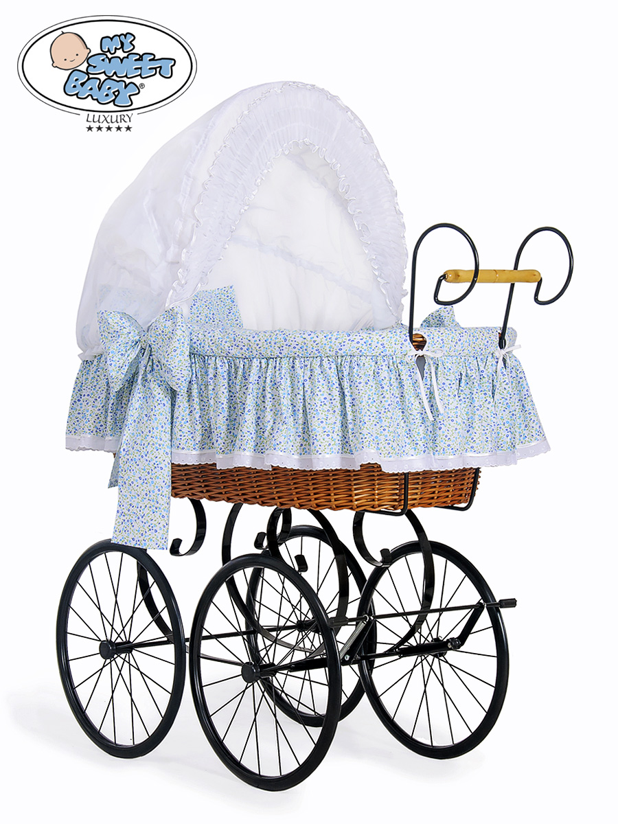 Retro babymand op een metalen, met de hand gebogen onderstel, met grote wielen met rubberen banden.