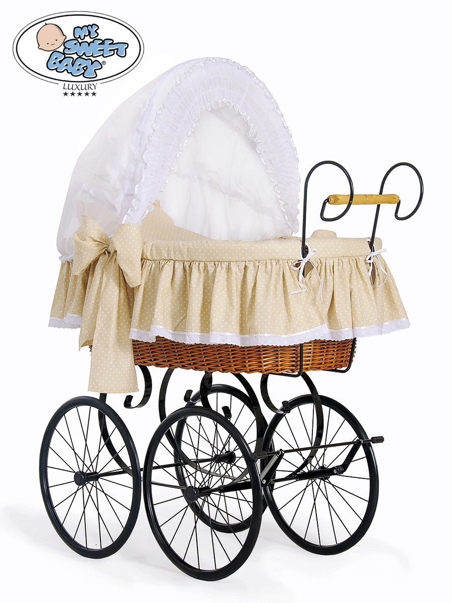 Nostalgiestubenwagen mit Weidenkorb mit einem Handgebogenen Untergestell in Retro Style. Den besondern Charakter unterstreichen die Metallräder. Speichen und der Griff mit Holz. Der weidenkorb ist Handgeflochten aus natur Weide. Die Haube kann zugeklappt werden. Bezug ist aus 100% Baumwolle mit öko tex Zertifikat genäht. Der Korbbezug ist mit einer Vliesschicht ausgestattet, was weich ist und die Geräuche dämpft.