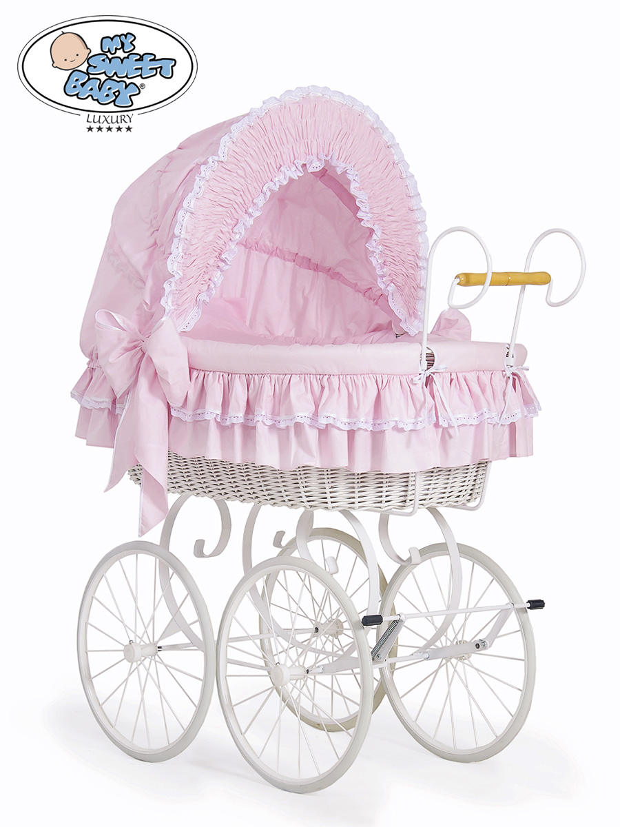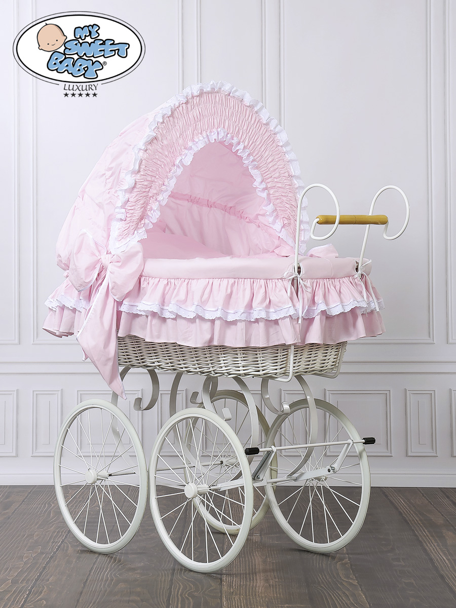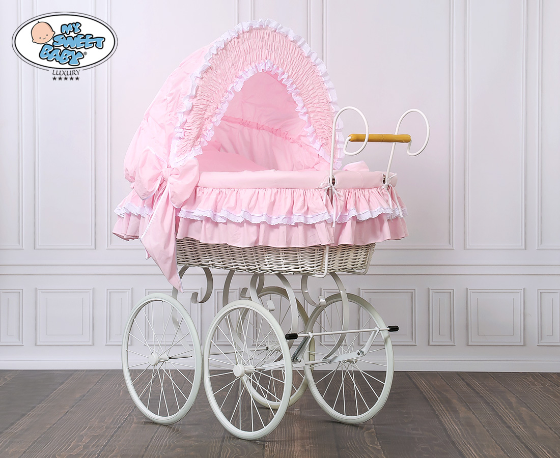 Retro babymand op een metalen, met de hand gebogen onderstel, met grote wielen met rubberen banden.