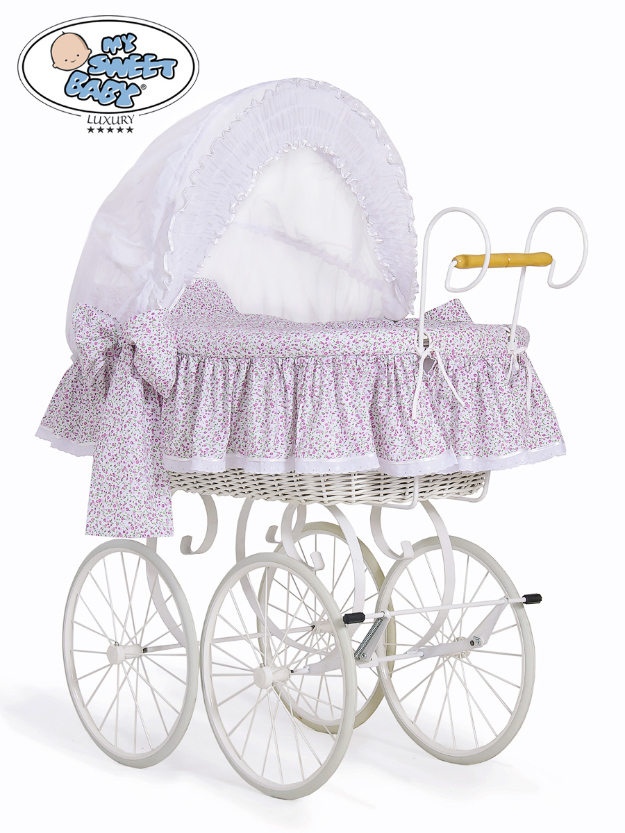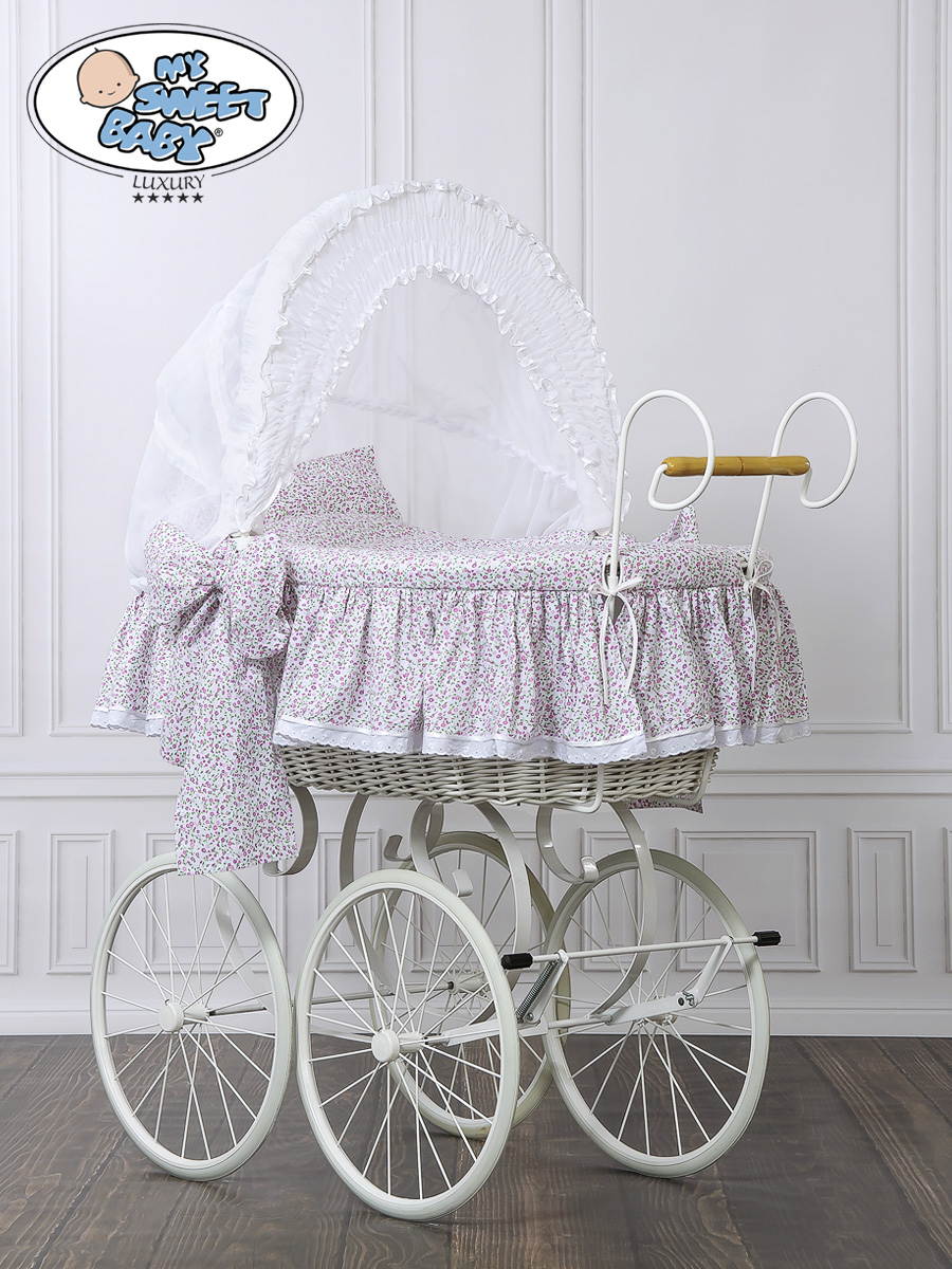 Retro babymand op een metalen, met de hand gebogen onderstel, met grote wielen met rubberen banden.