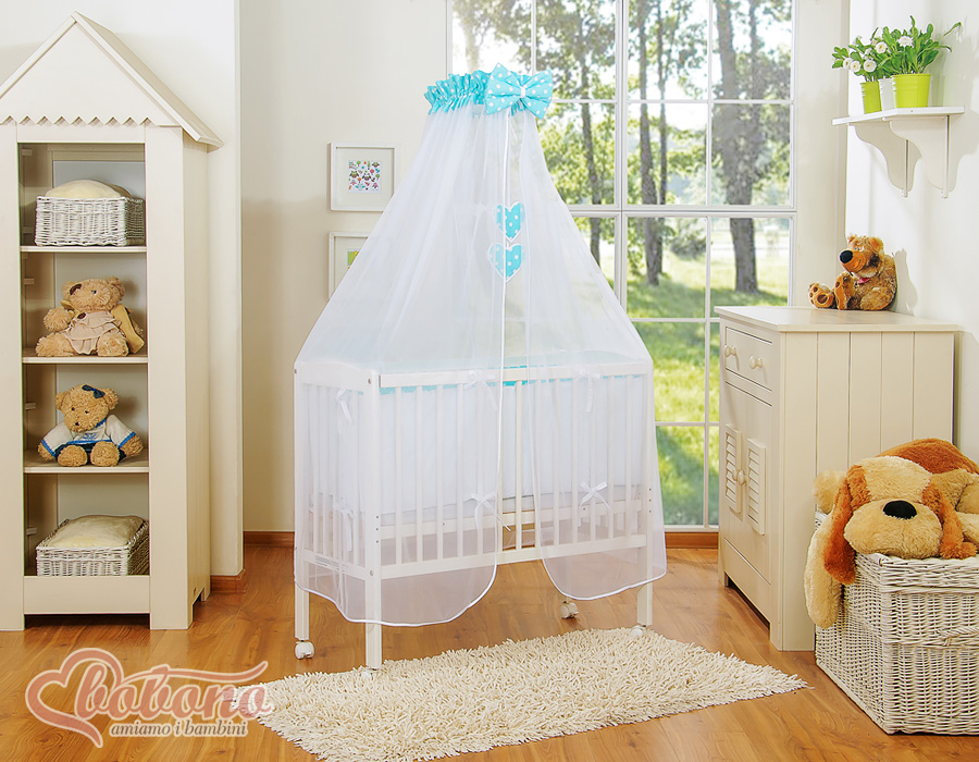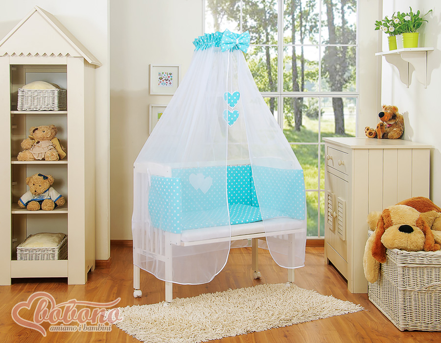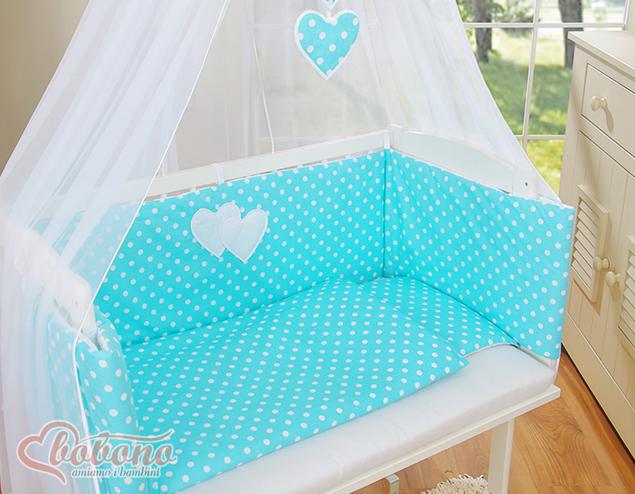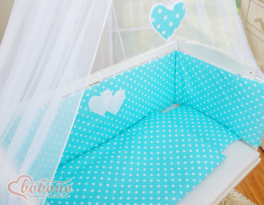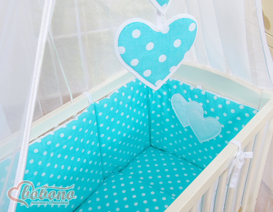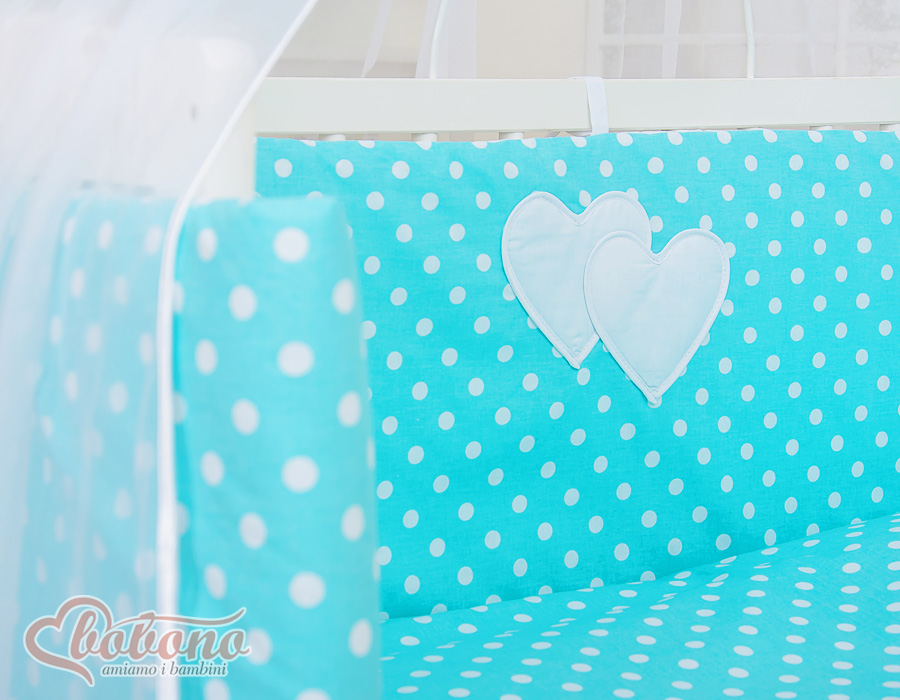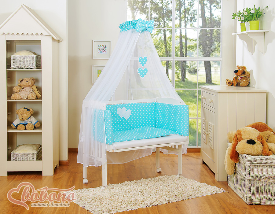 Kleinbaby.nl » Ledikanten 120x60 cm » Bijzetbed » bedkant wieg met Beddengoed » Co-sleeper Kinderbed met Matras en beddengoed - Turkoois Polkaprikker