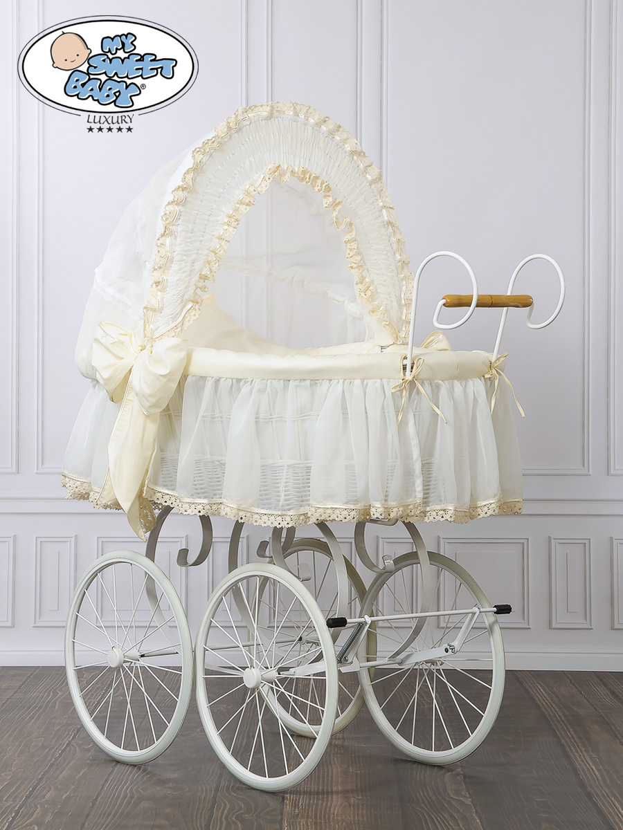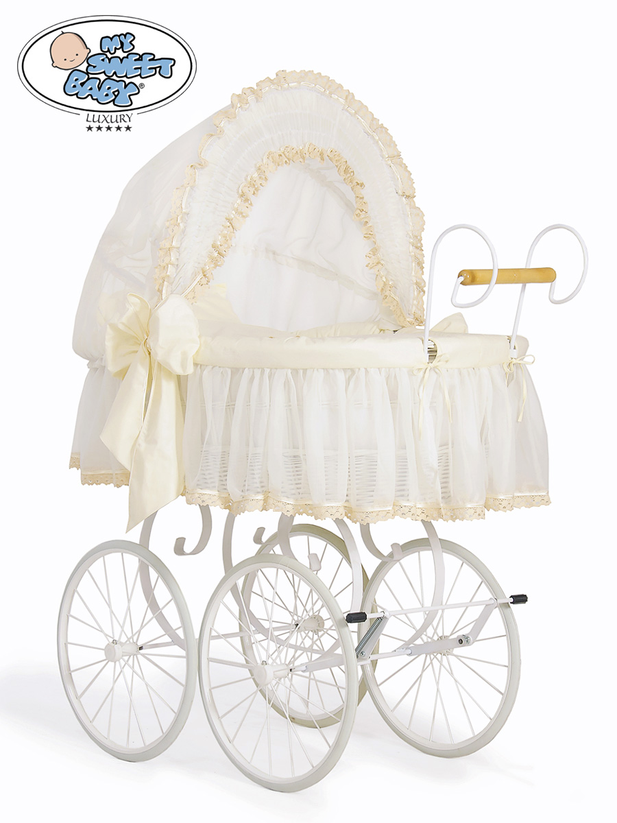 Retro babywieg op een metalen, met de hand gebogen onderstel, met grote wielen met rubberen banden.