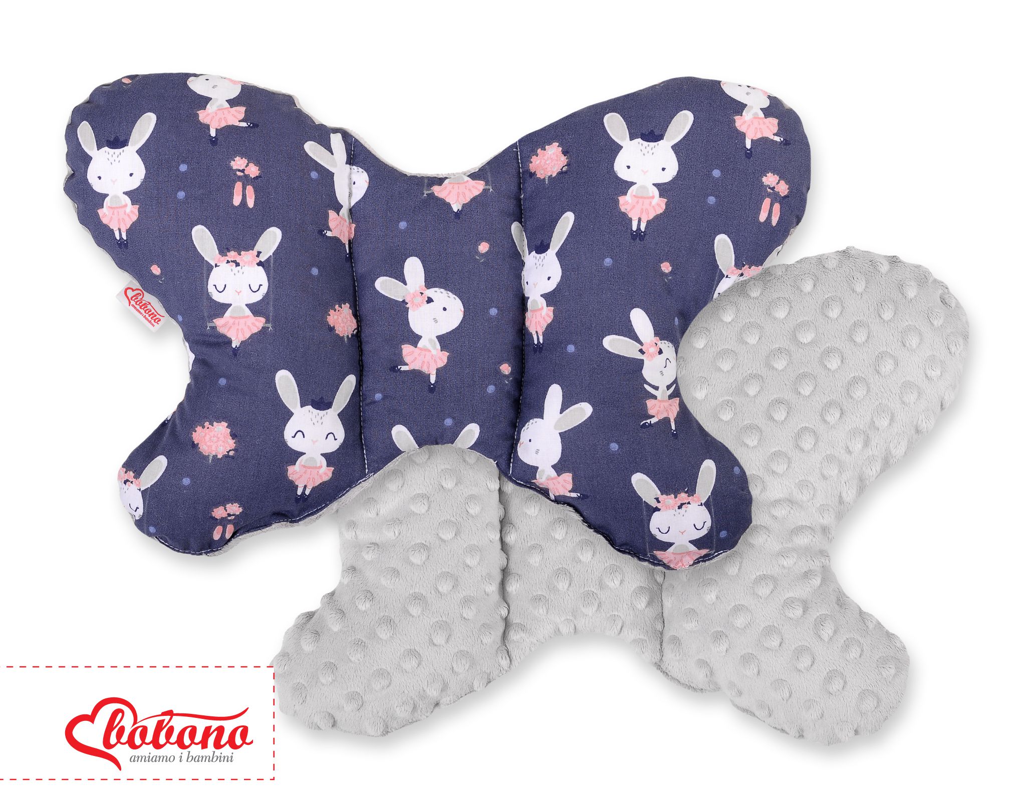 Kleinbaby.nl » Kinderwagen Autostoel » Dubbelzijdig Antischokkussen voor Baby » Dubbelzijdig Antischokkussen "Vlinder" Grijs Donkerblauw Konijnen