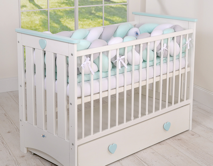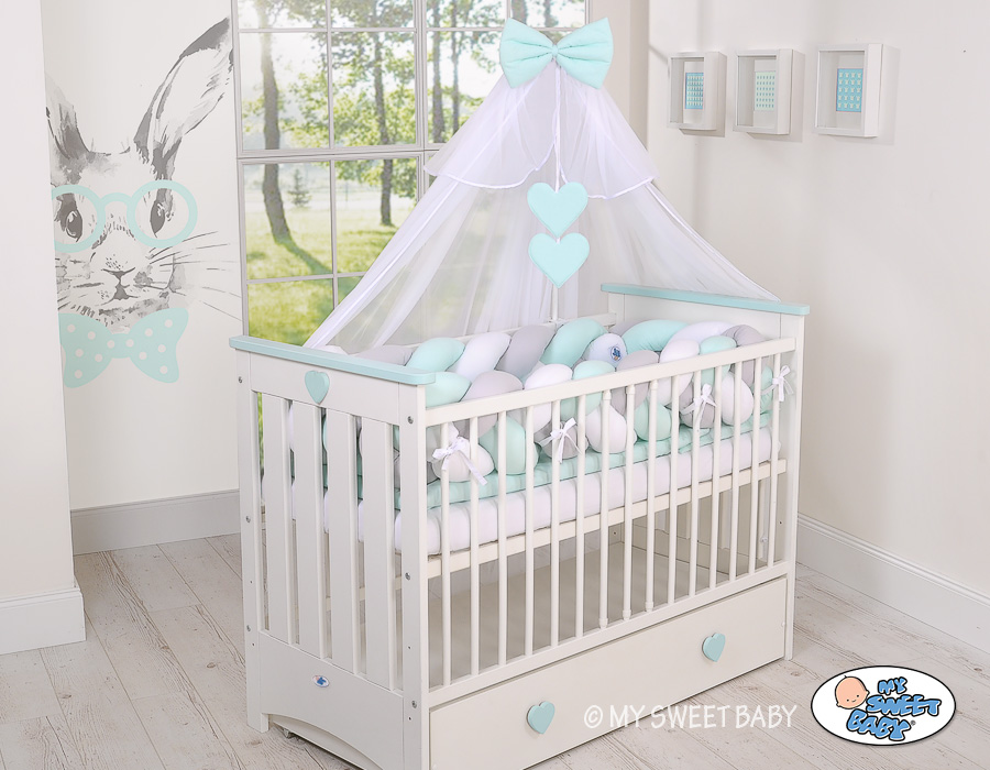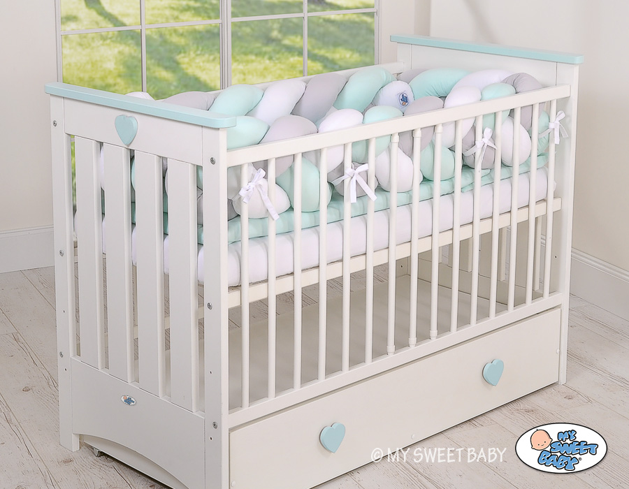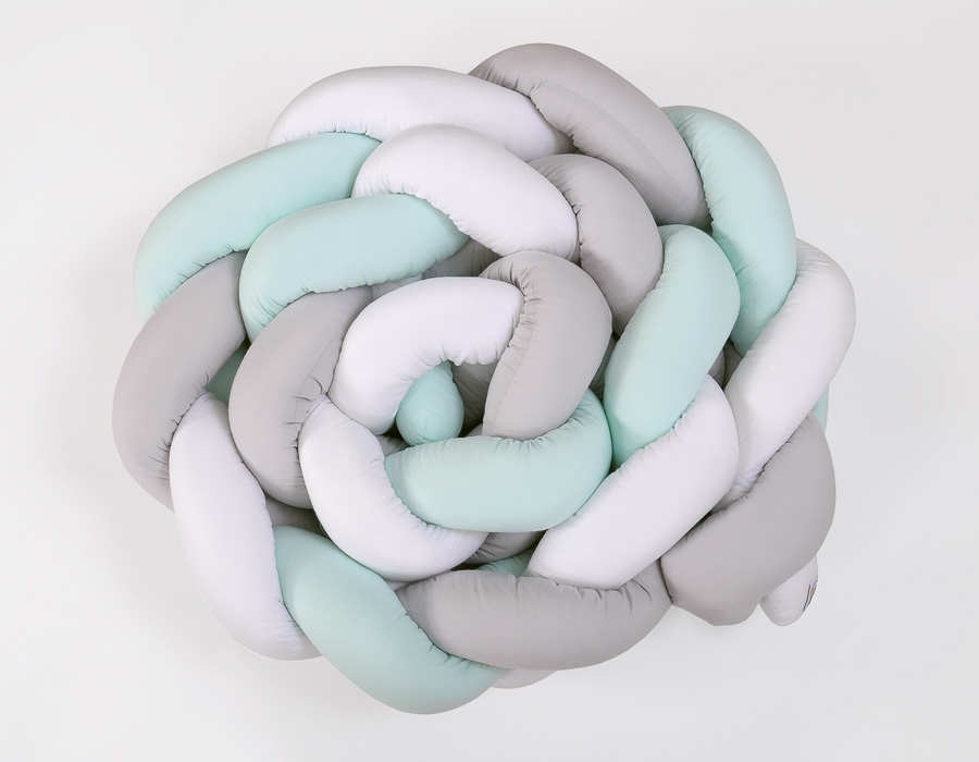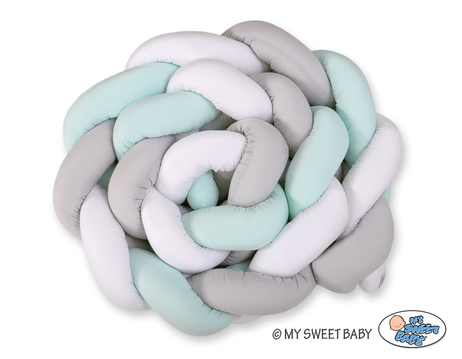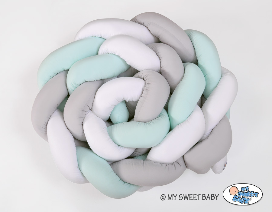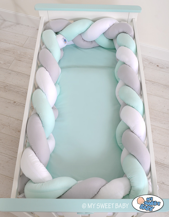 Kleinbaby.nl » Gevlochten Collectie » Gevlochten Bedbumper » Gevlochten Bedomrander Ledikant XXL Knoop Mint Wit Grijs