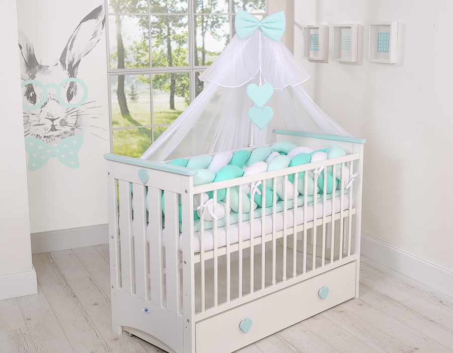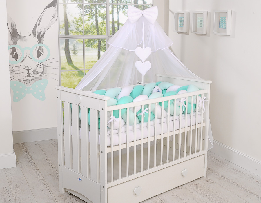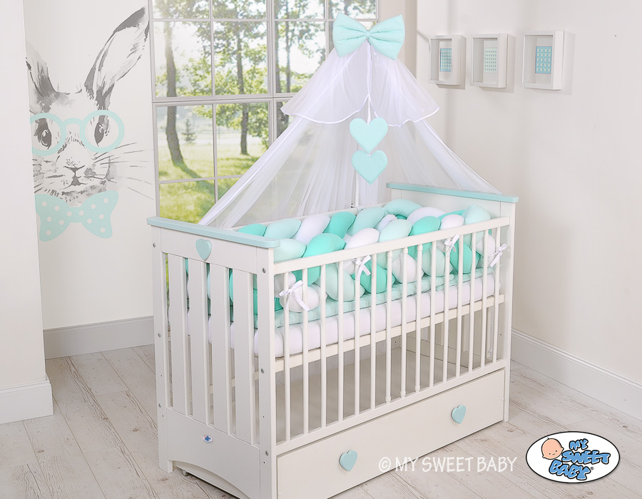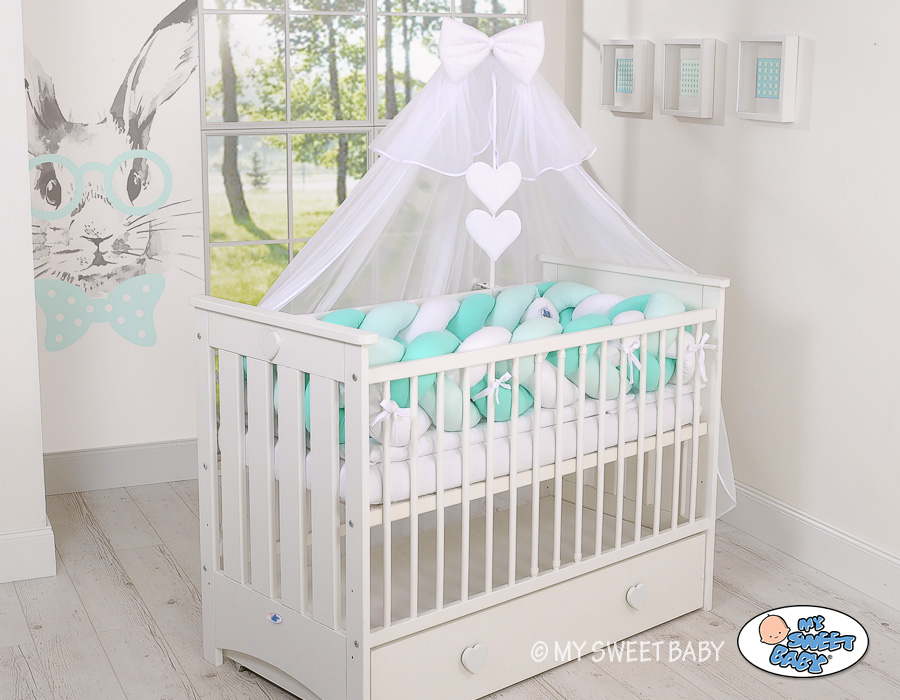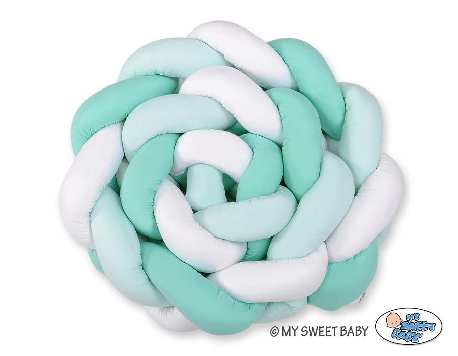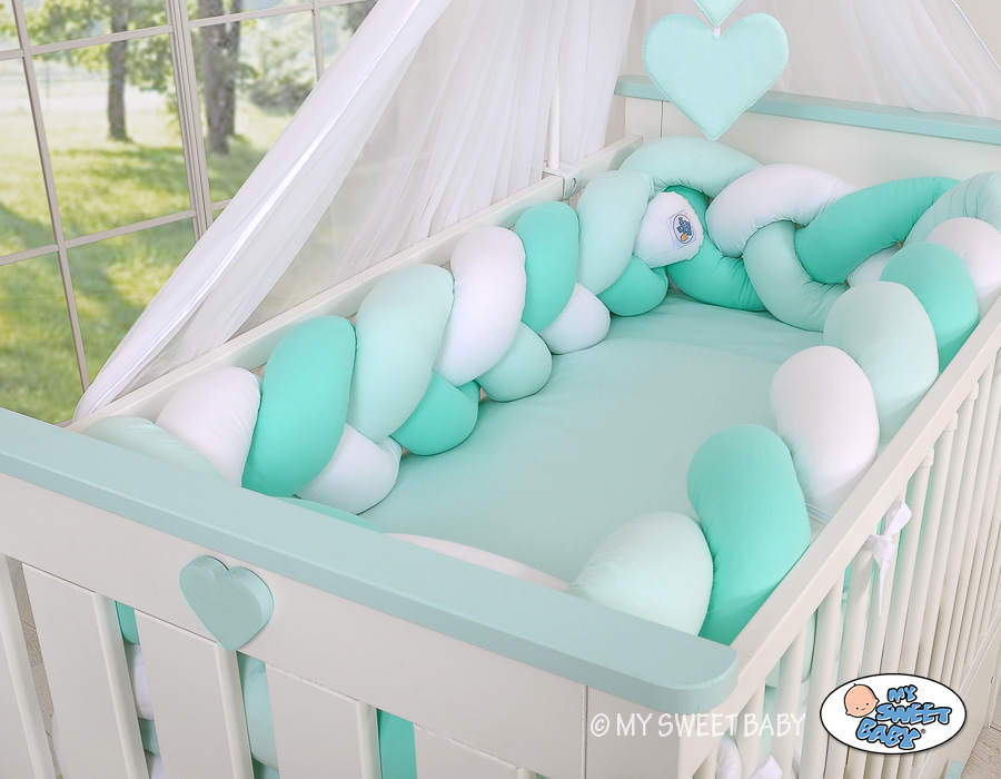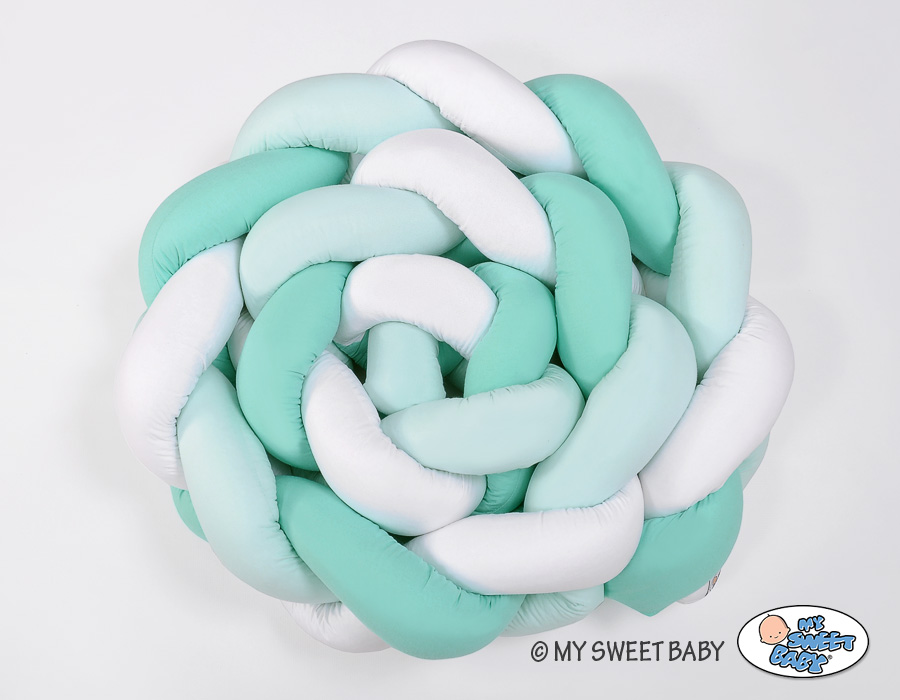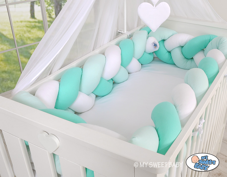 Kleinbaby.nl » Gevlochten Collectie » Gevlochten Bedbumper » Gevlochten Bedomrander Ledikant XXL Knoop Mint Wit