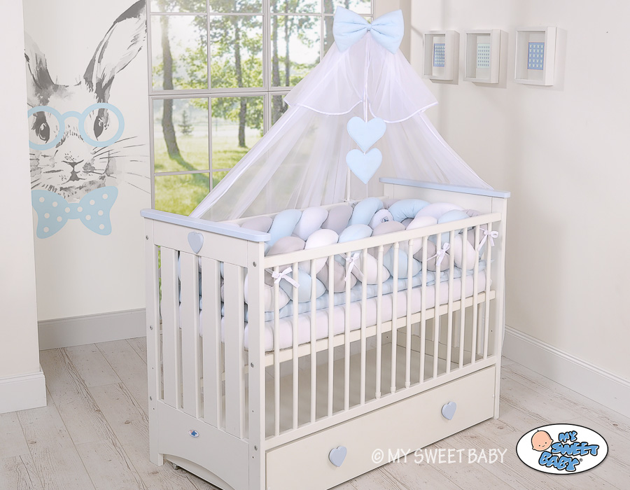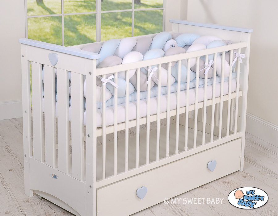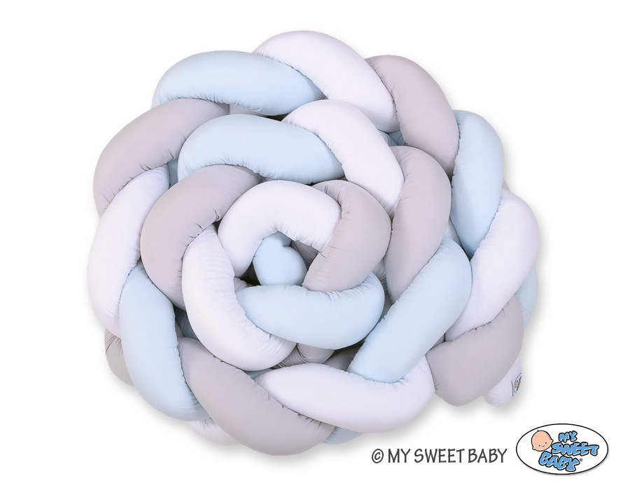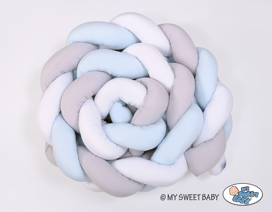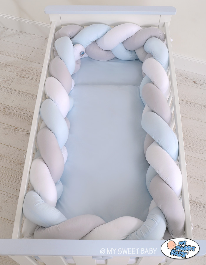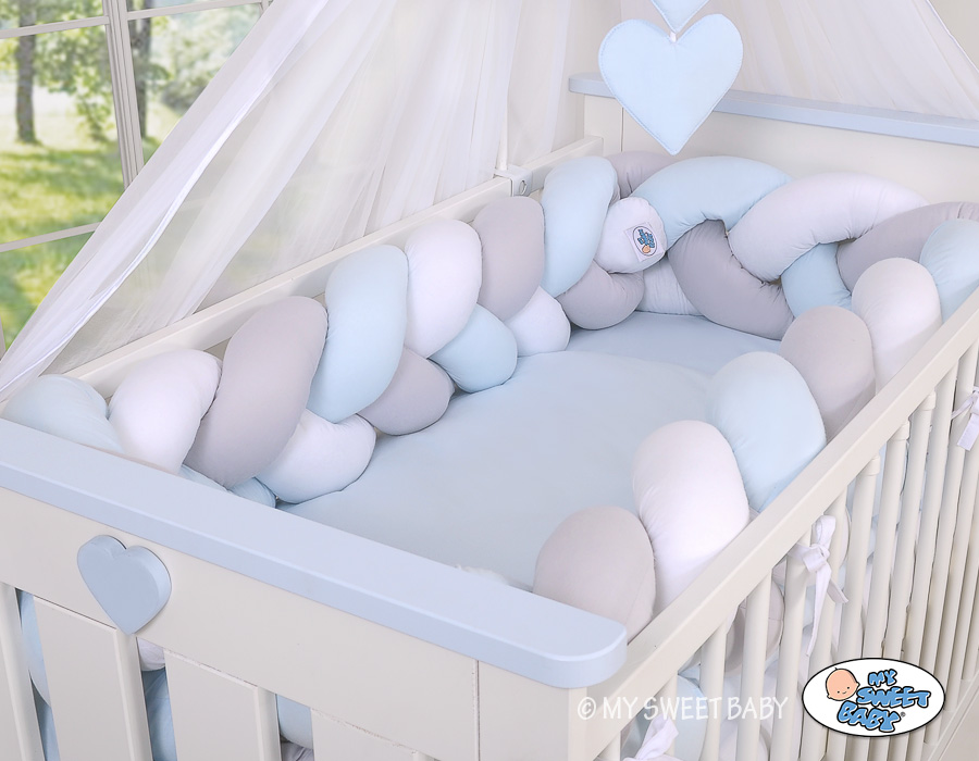 Kleinbaby.nl » Gevlochten Collectie » Gevlochten Bedbumper » Gevlochten Bedomrander Ledikant XXL Knoop Wit Grijs Blauw