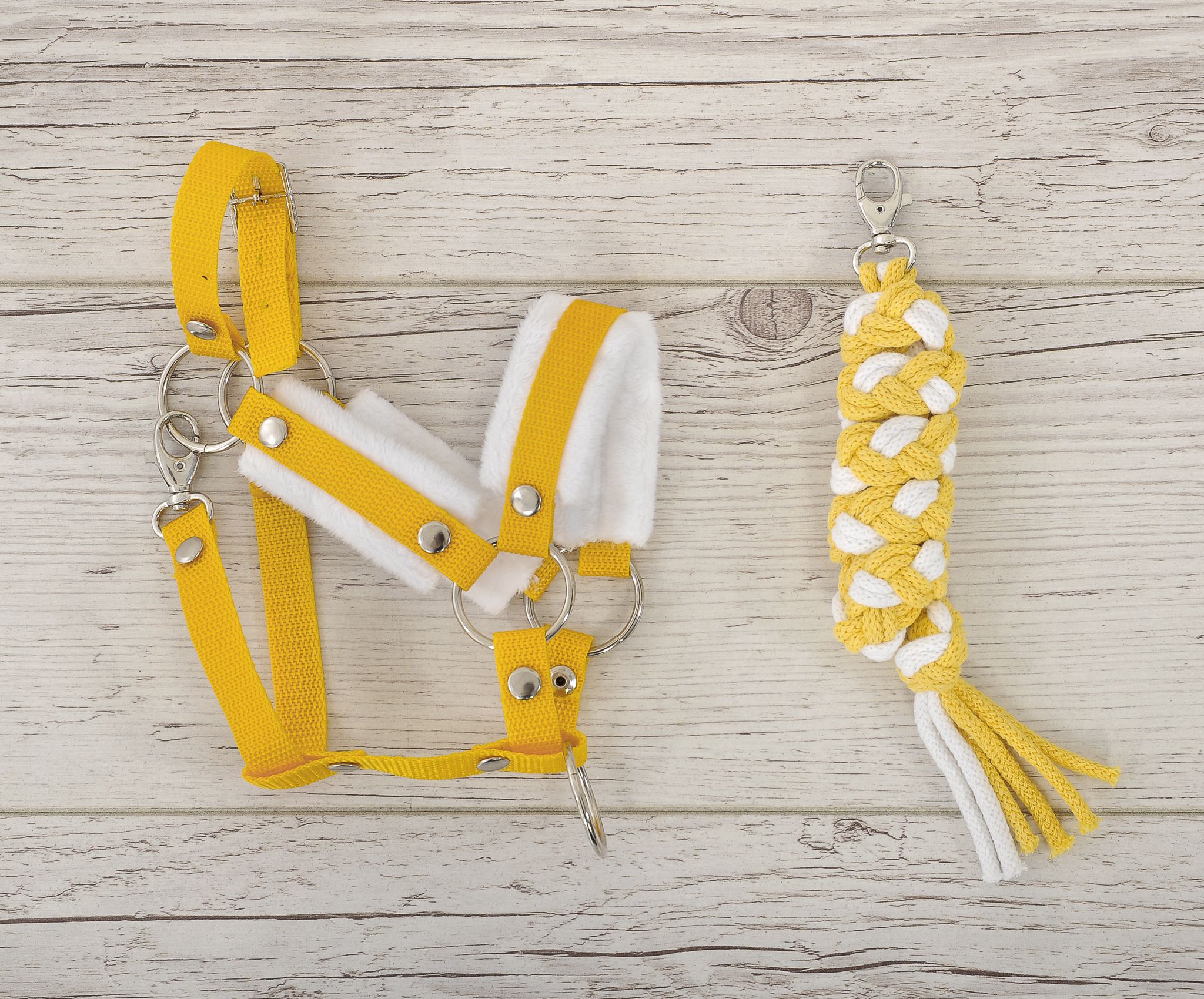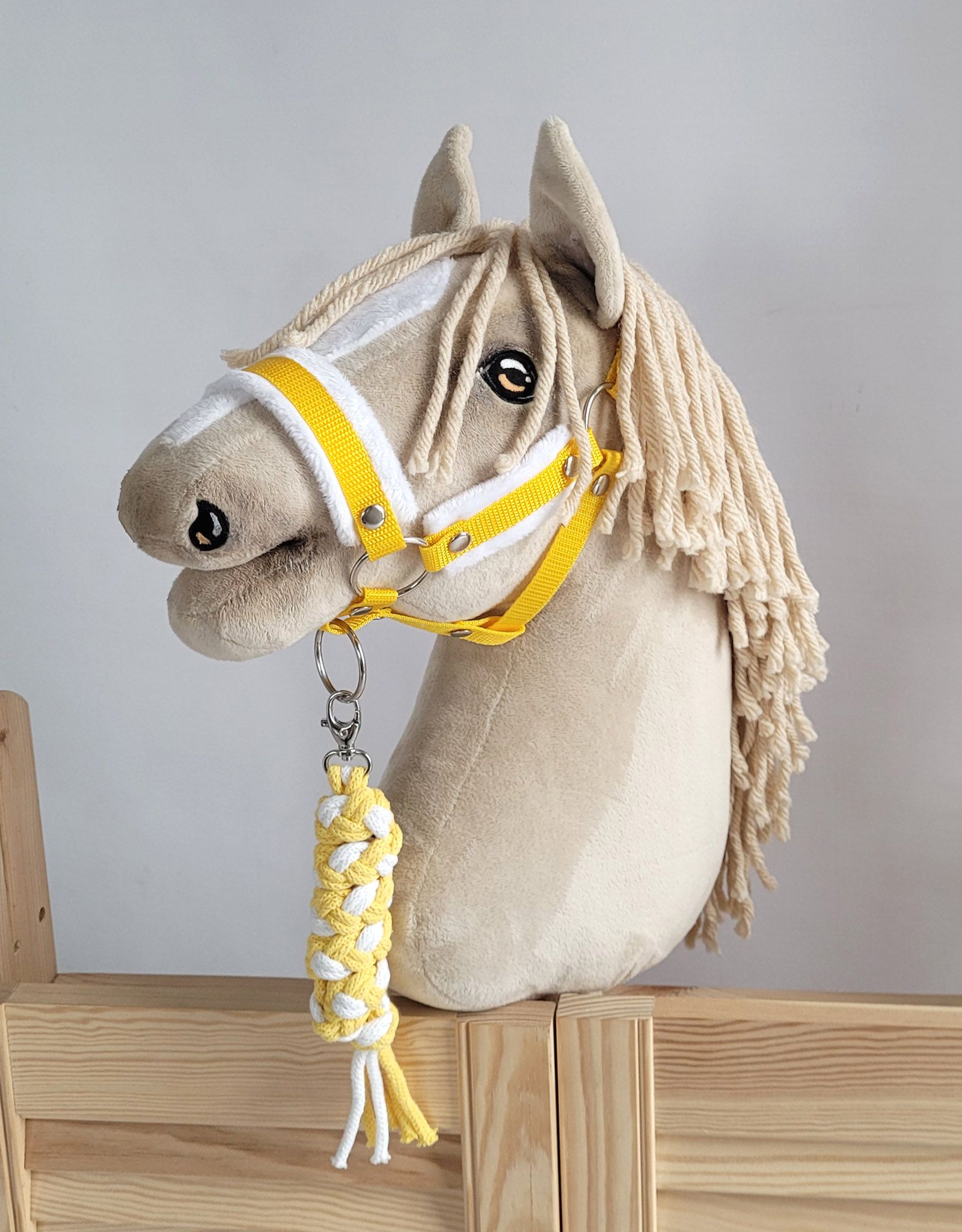 Kleinbaby.nl » Speelgoed Knuffels » Hobby Horse - Stokpaarden en Accessoires » Touwen voor Stokpaardjes » Halster A3 met wit bont en Gevlochten paardenlijn voor Stokpaard Wit Geel