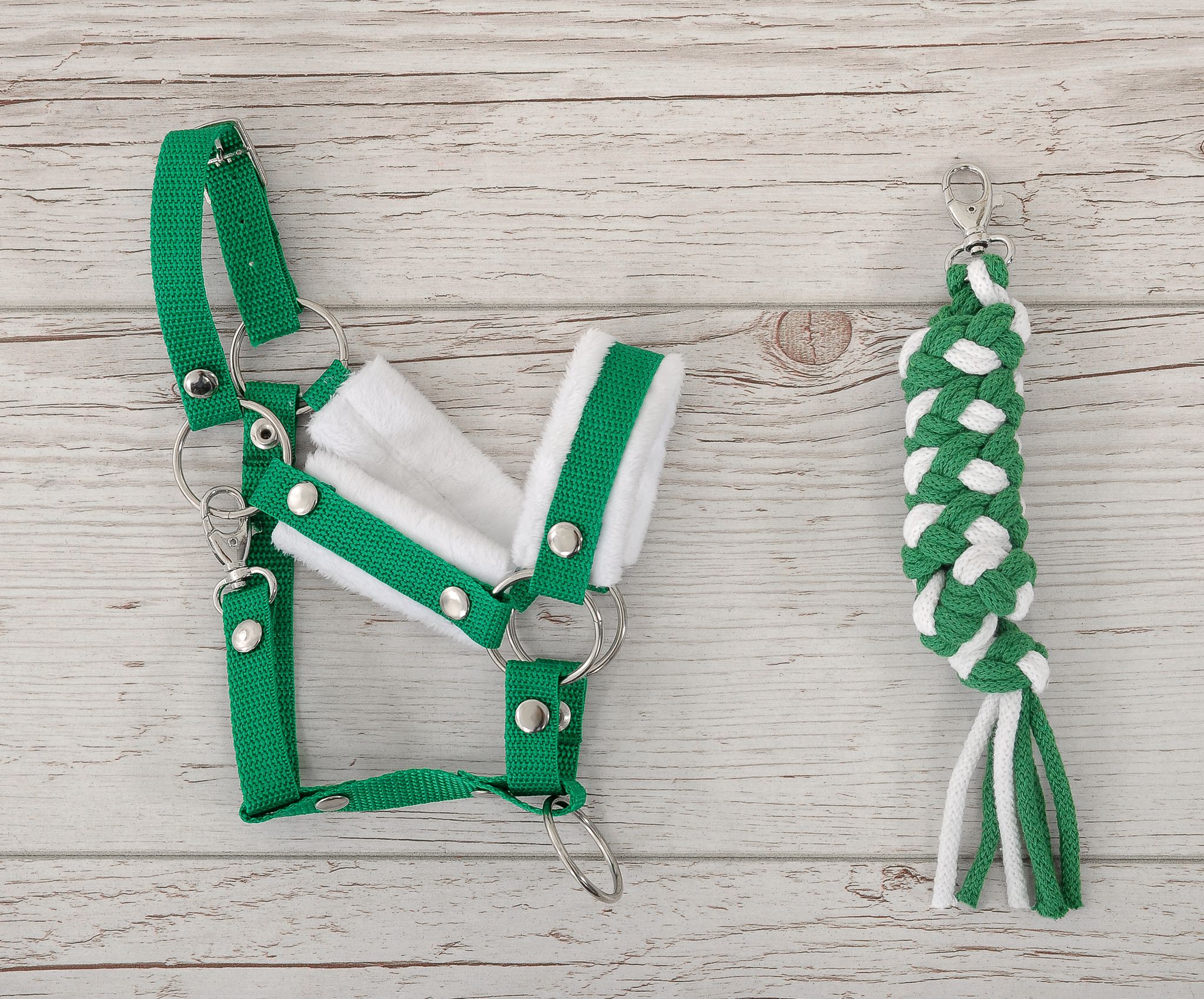 Kleinbaby.nl » Speelgoed Knuffels » Hobby Horse - Stokpaarden en Accessoires » Touwen voor Stokpaardjes » Halster A3 met wit bont en Gevlochten paardenlijn voor Stokpaard Wit Groen