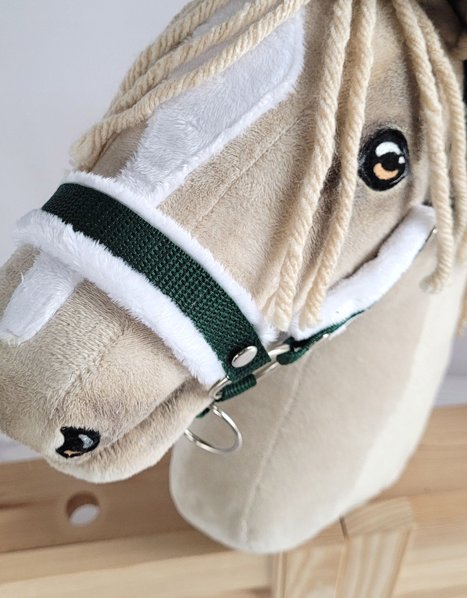 Een praktisch en duurzaam halster met bont voor de Hobby Horse. Gemaakt van hoogwaardig band van 1,5 cm breed en zacht Minky-materiaal. Verstelbare gesp voor een perfecte pasvorm bij het paard. Eenvoudige sluiting met een karabijnhaak. Metalen elementen van het halster - zoals de sluitingen, metalen ringen, verstelgesp en karabijnhaaksluiting - zijn zilverkleurig. Alles elegant en praktisch. Het halster is gemakkelijk te hanteren, sterk en vuilafstotend. Er worden veel trendy kleuren aangeboden die perfect bij onze Hobby Horses passen.