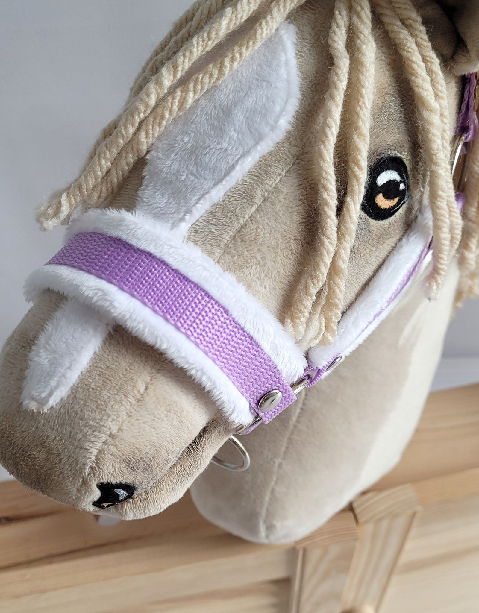 Een praktisch en duurzaam halster met bont voor de Hobby Horse. Gemaakt van hoogwaardig band van 1,5 cm breed en zacht Minky-materiaal. Verstelbare gesp voor een perfecte pasvorm bij het paard. Eenvoudige sluiting met een karabijnhaak. Metalen elementen van het halster - zoals de sluitingen, metalen ringen, verstelgesp en karabijnhaaksluiting - zijn zilverkleurig. Alles elegant en praktisch. Het halster is gemakkelijk te hanteren, sterk en vuilafstotend. Er worden veel trendy kleuren aangeboden die perfect bij onze Hobby Horses passen.