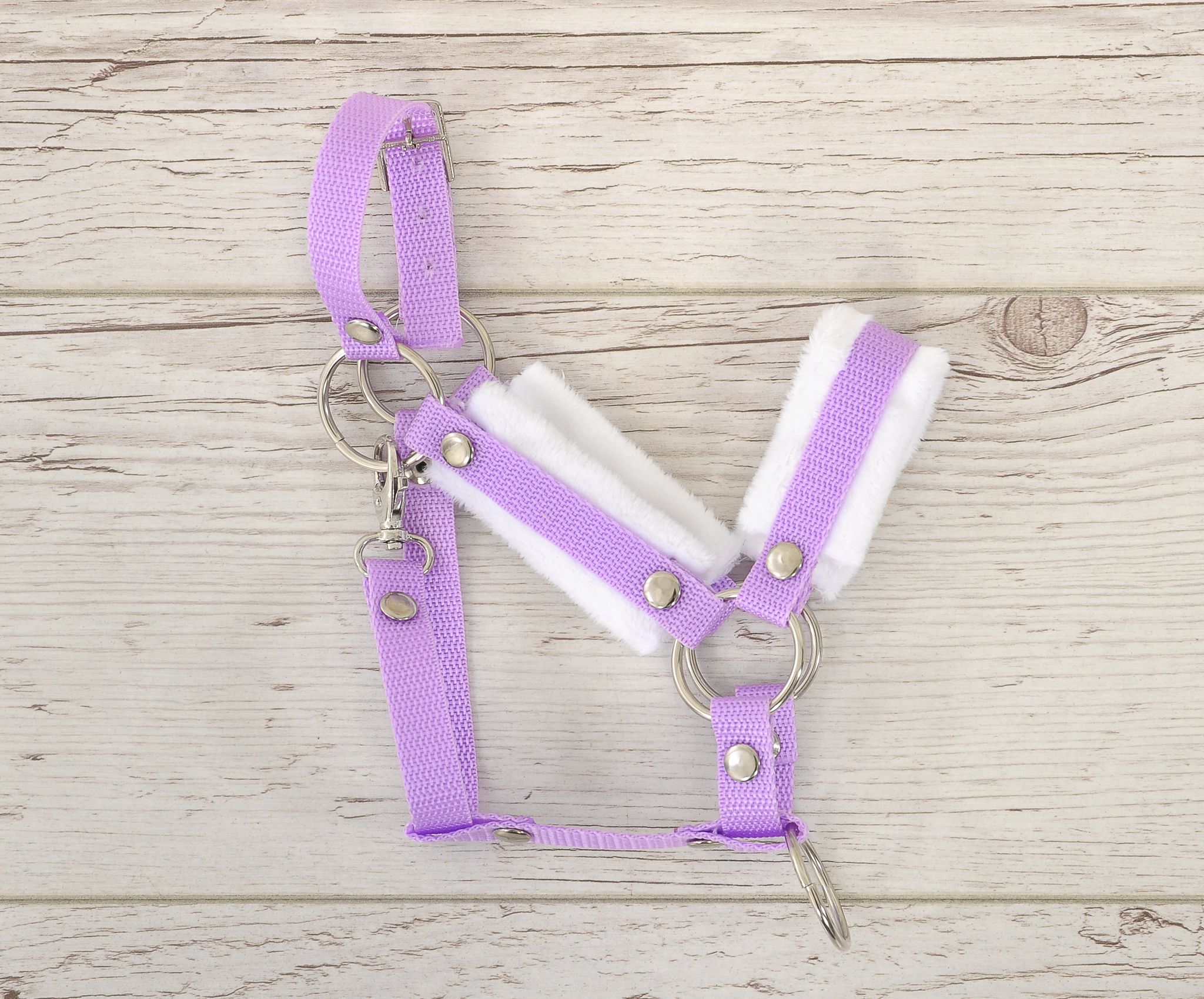 Een praktische en duurzame halster met bont voor het hobbypaard. Gemaakt van hoogwaardig singelband van 1,5 cm breed en zacht minky-materiaal. Verstelbare gesp voor een perfecte pasvorm op het paard. Eenvoudige sluiting met karabijnhaak. Metalen elementen van de halster, zoals de gespen, metalen ringen, gesp voor aanpassing en karabijnhaaksluiting in zilverkleur. Allemaal elegant en praktisch. De halster is gemakkelijk te hanteren, stevig en vuilafstotend. Er worden veel modieuze kleuren aangeboden, die perfect kunnen worden afgestemd op onze hobbypaarden.