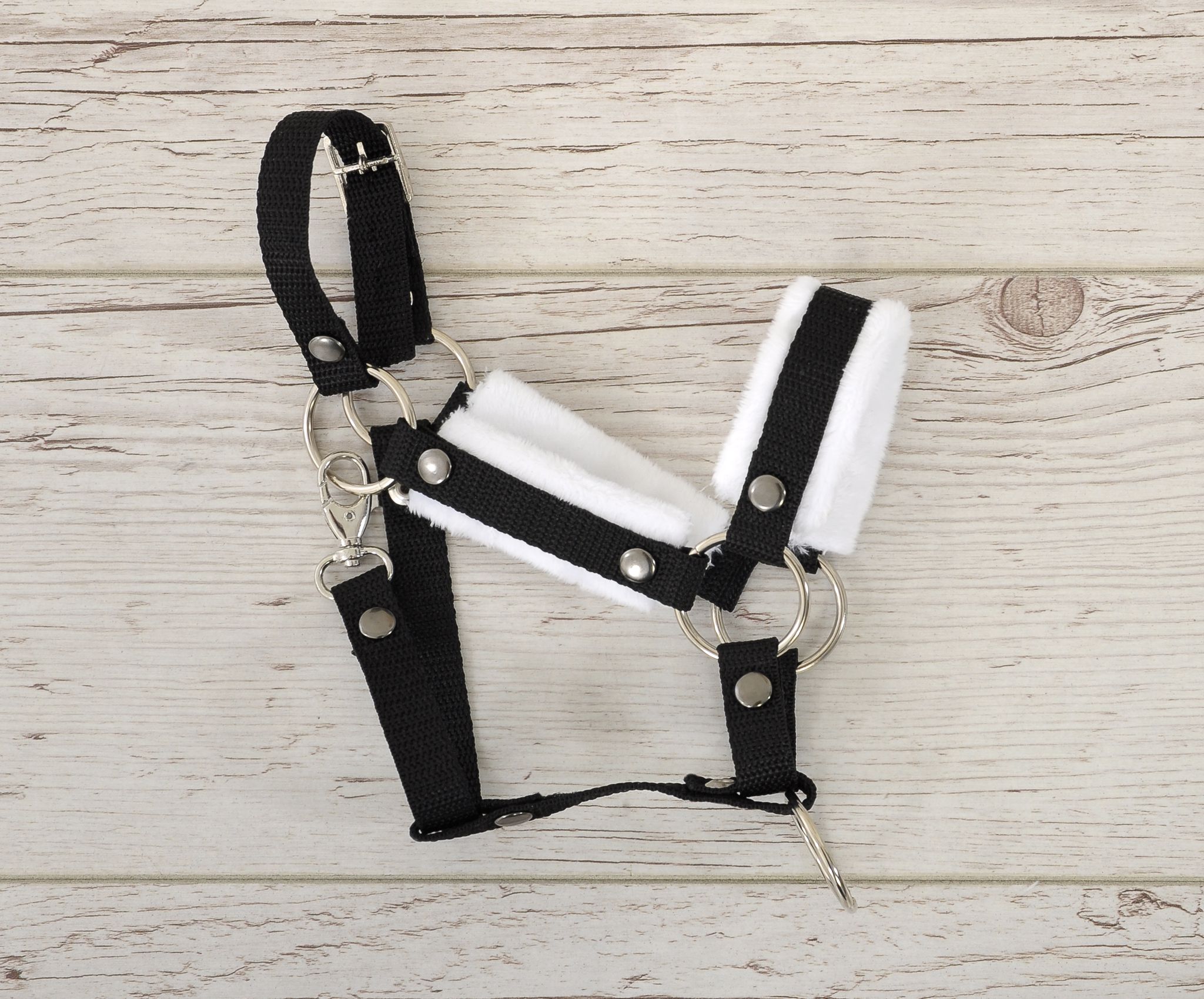 Een praktische en duurzame halster met bont voor het hobbypaard. Gemaakt van hoogwaardig singelband van 1,5 cm breed en zacht minky-materiaal. Verstelbare gesp voor een perfecte pasvorm op het paard. Eenvoudige sluiting met karabijnhaak. Metalen elementen van de halster, zoals de gespen, metalen ringen, gesp voor aanpassing en karabijnhaaksluiting in zilverkleur. Allemaal elegant en praktisch. De halster is gemakkelijk te hanteren, stevig en vuilafstotend. Er worden veel modieuze kleuren aangeboden, die perfect kunnen worden afgestemd op onze hobbypaarden.