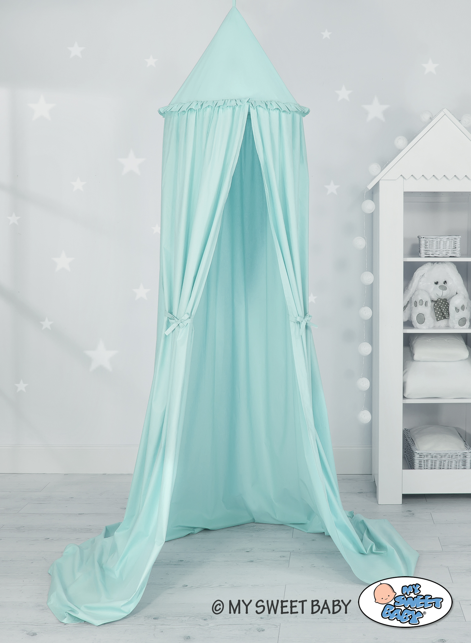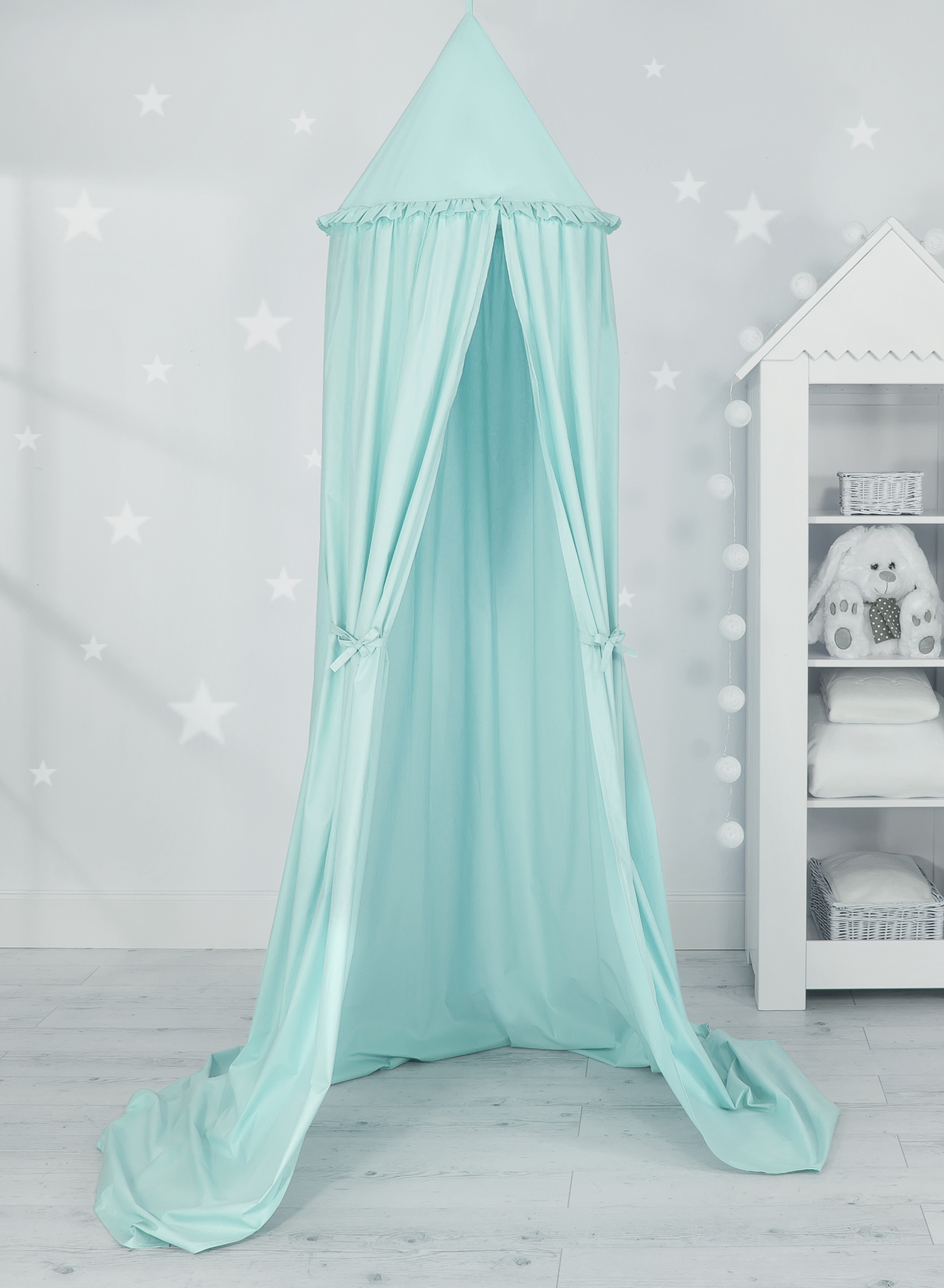 Een lange, hangende klamboesluier van katoen. Een prachtig element in de kinderkamer. Het kan gebruikt worden als unieke decoratie van een ledikant, maar het kan eveneens een prachtige plek vormen om in te spelen. Hang de luifel over het ledikant en bescherm je baby tegen te veel licht en lawaai, het creëert tevens een knusse en veilige plek om in te rusten. De luifel kan gemakkelijk bevestigd worden aan het plafond. De lengte van 260 cm maakt het mogelijk om de uiteinden op de vloer te leggen. Dit creëert een perfecte schuilplaats en speelplek voor oudere kinderen. De luifel is gemaakt van Oekotex-gecertificeerd 100% katoen. Aan de zijkanten zitten praktische linten om de luifel vast te binden en er een prachtige tent van te maken. De rand aan de bovenkant kan worden verwijderd. De stof kan gewassen worden op 30 graden.