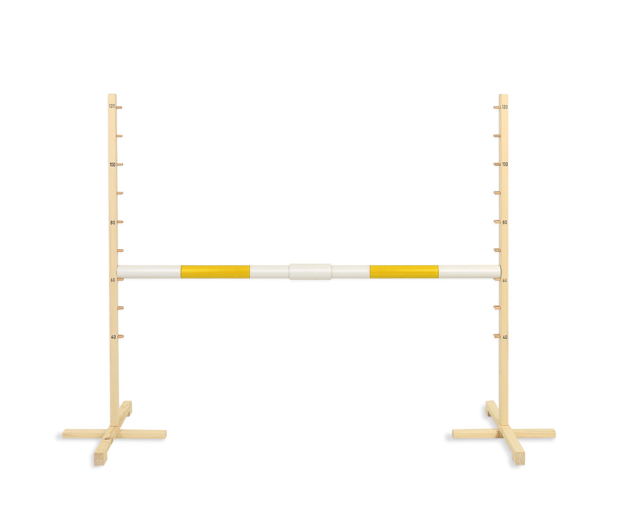 De stang kan worden ingesteld op een hoogte tussen 40 cm en 120 cm, afhankelijk van de lengte en motorische vaardigheden van het kind. De balk is ontworpen om neer te vallen wanneer er met de voet tegenaan wordt gestoten. Er is geen mogelijkheid voor het kind om tijdens de sprong om te vallen.