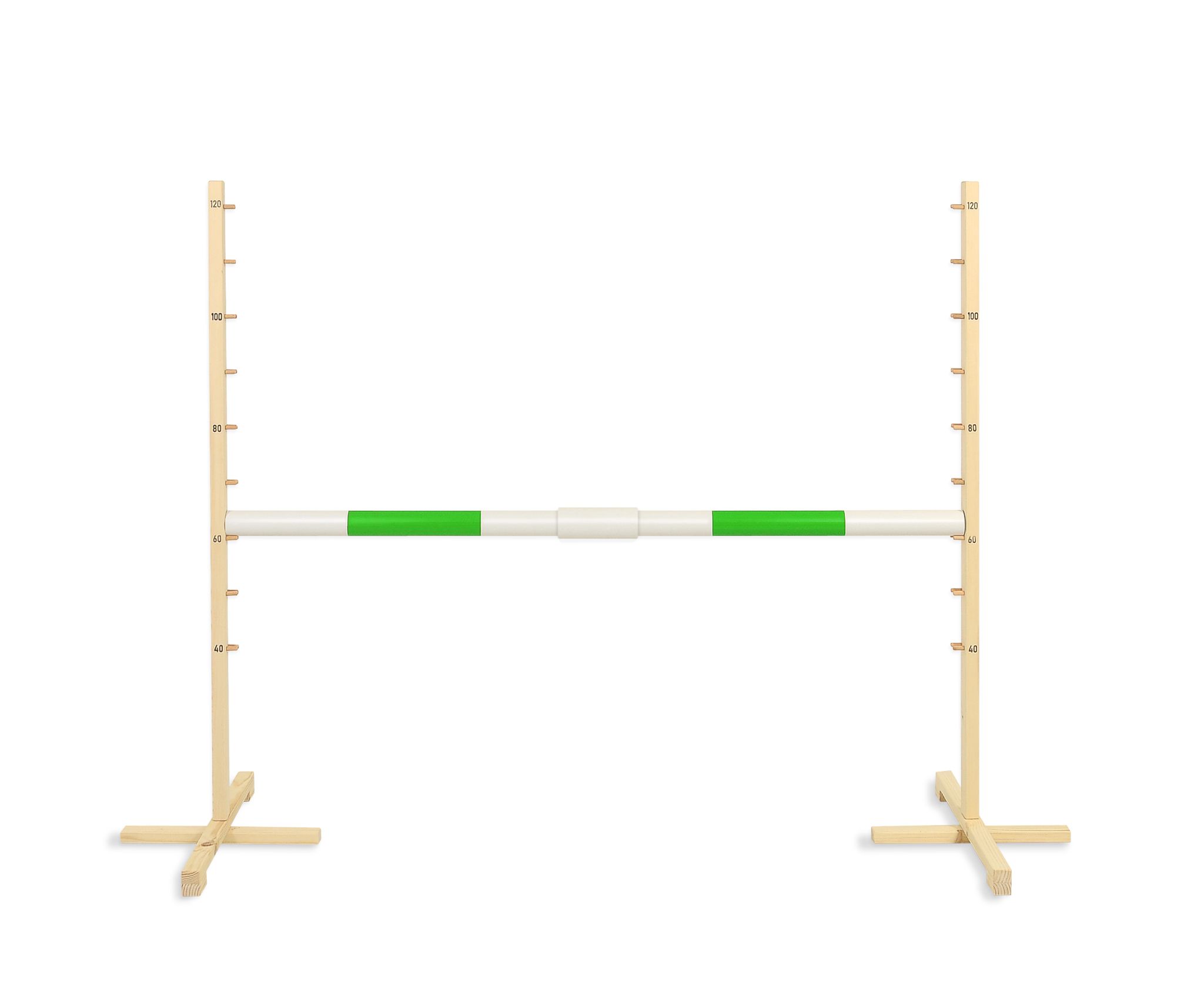 De stang kan worden ingesteld op een hoogte tussen 40 cm en 120 cm, afhankelijk van de lengte en motorische vaardigheden van het kind. De balk is ontworpen om neer te vallen wanneer er met de voet tegenaan wordt gestoten. Er is geen mogelijkheid voor het kind om tijdens de sprong om te vallen.