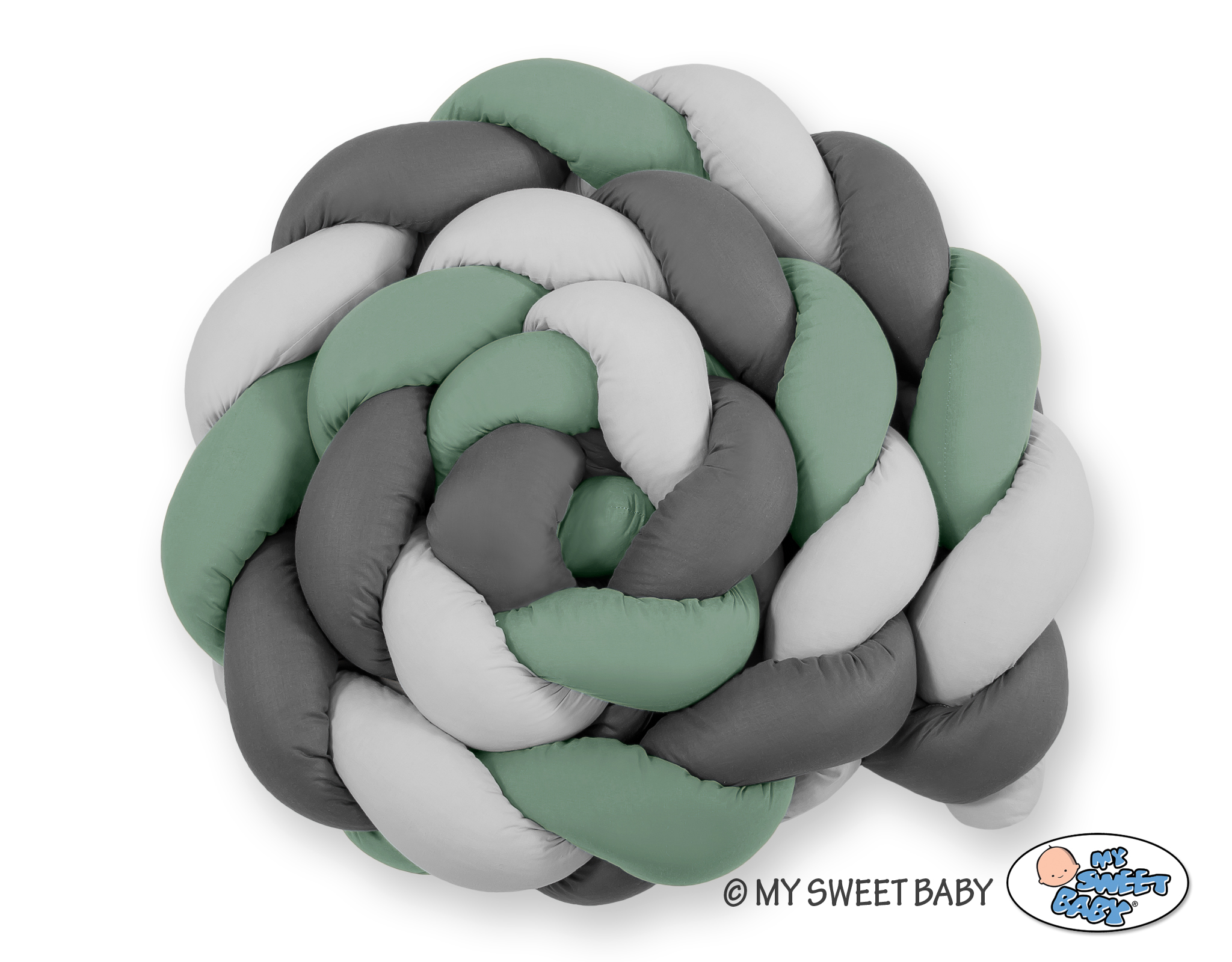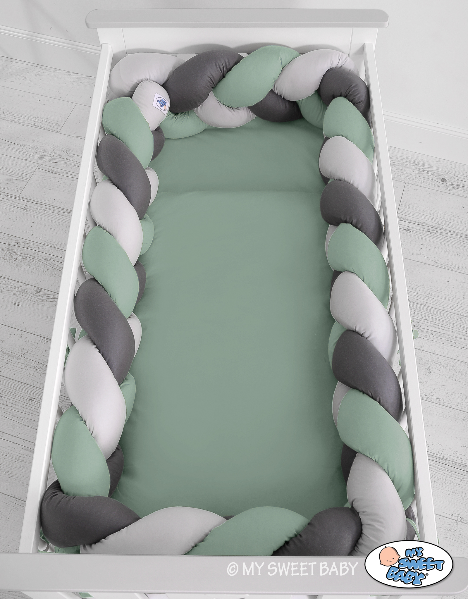 Kleinbaby.nl » Gevlochten Collectie » Gevlochten Bedbumper » Hoofdbeschermer Gevlochten 360cm Ledikant Grijs Pastelgroen Antraciet