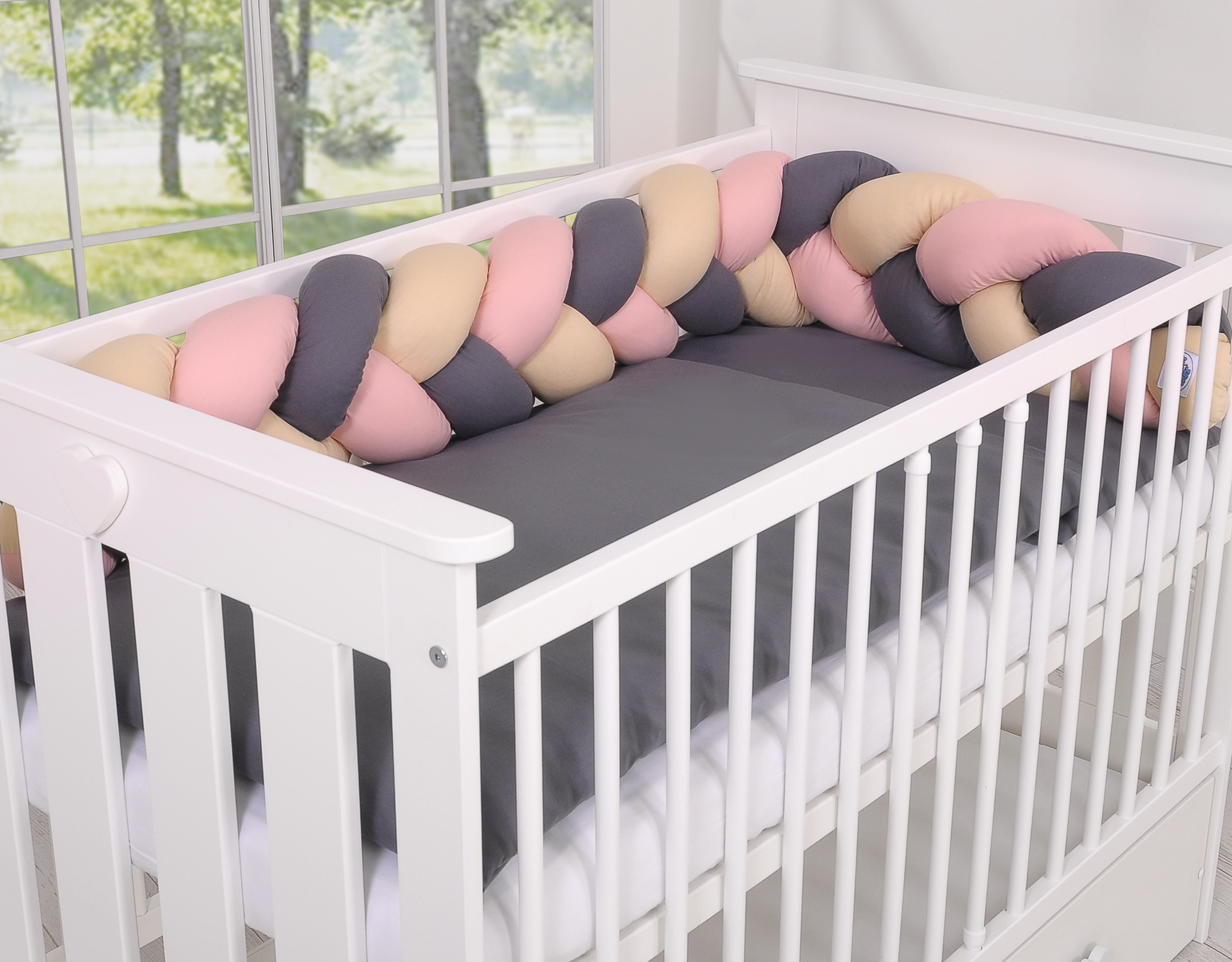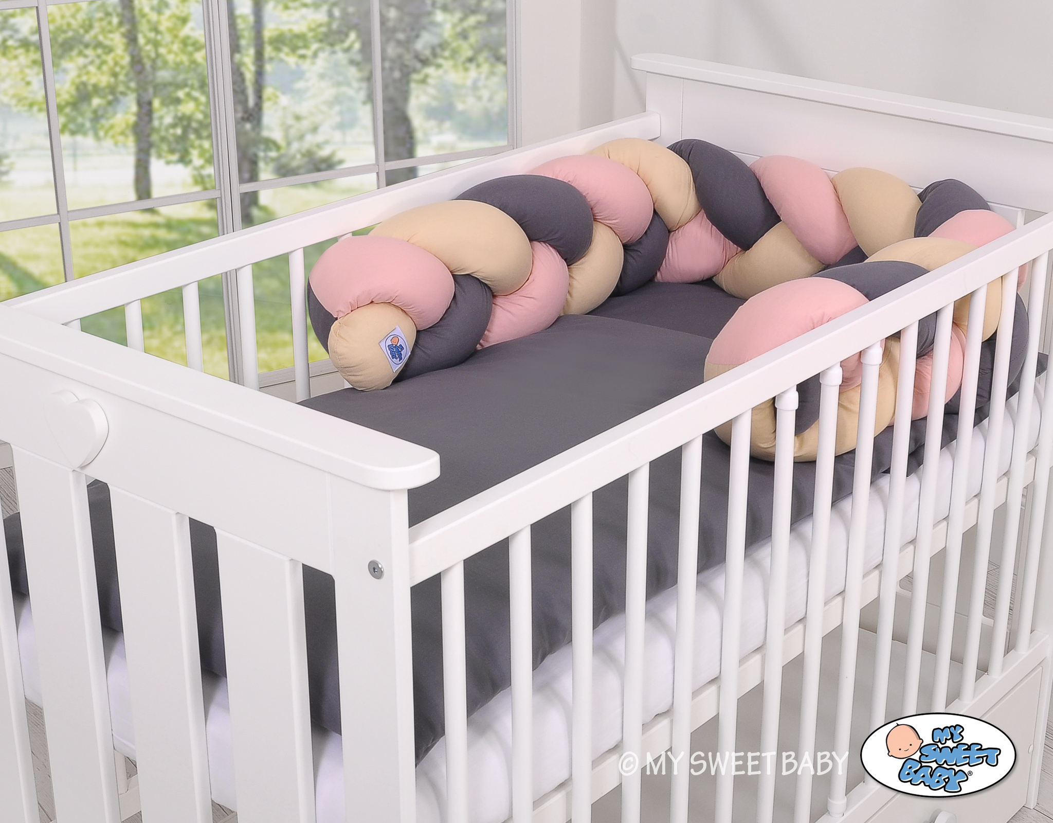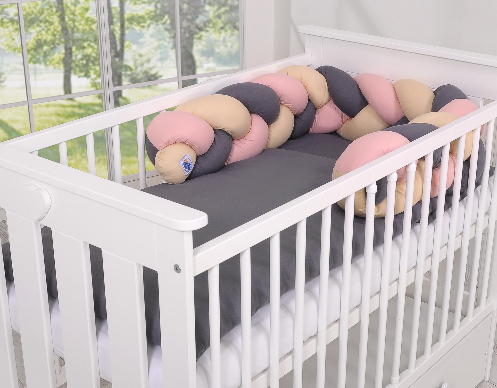 Kleinbaby.nl » Gevlochten Collectie » Gevlochten Bedomrander » Hoofdbeschermer Gevlochten voor Ledikant 180cm Beige Antraciet Stofroze