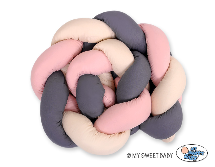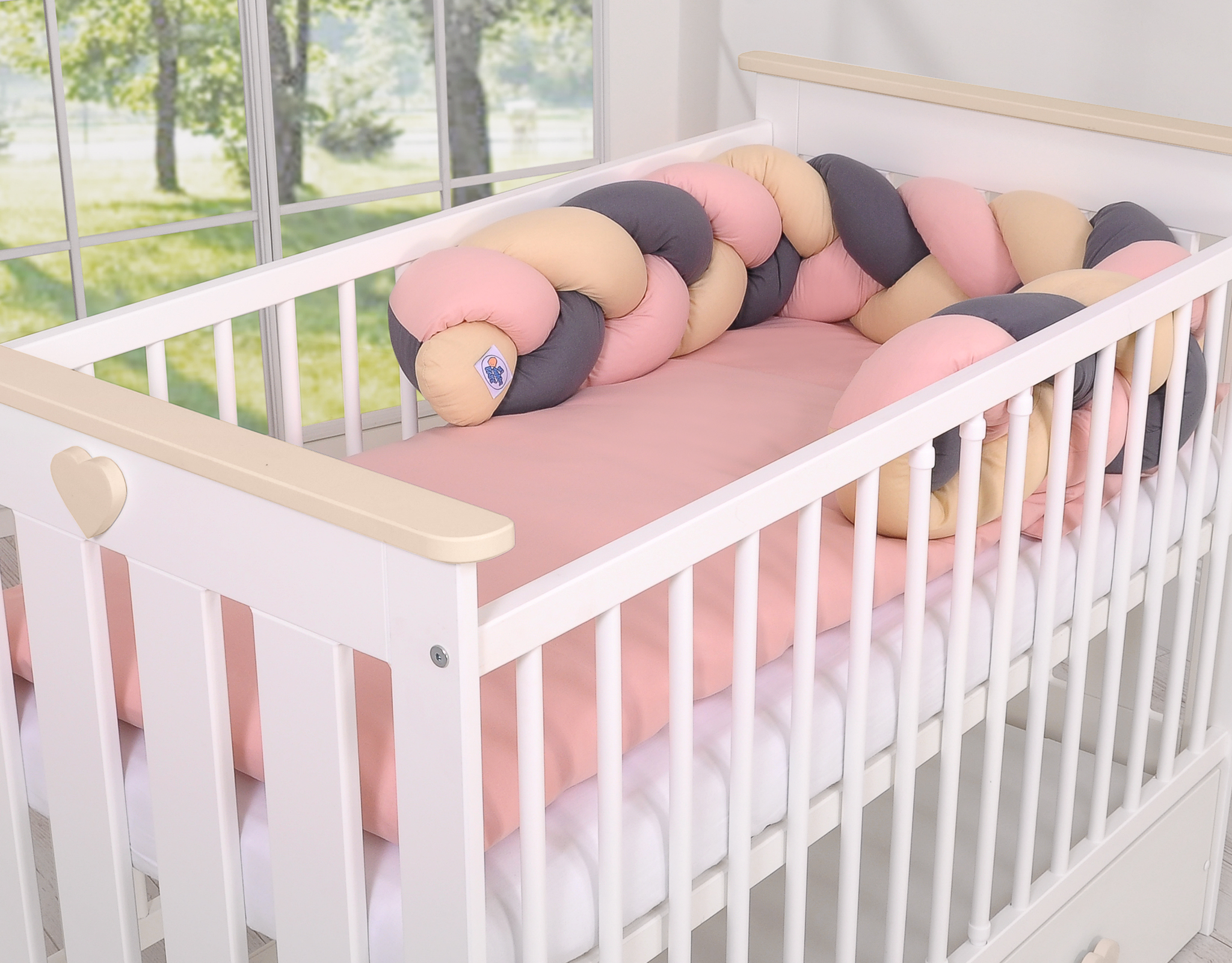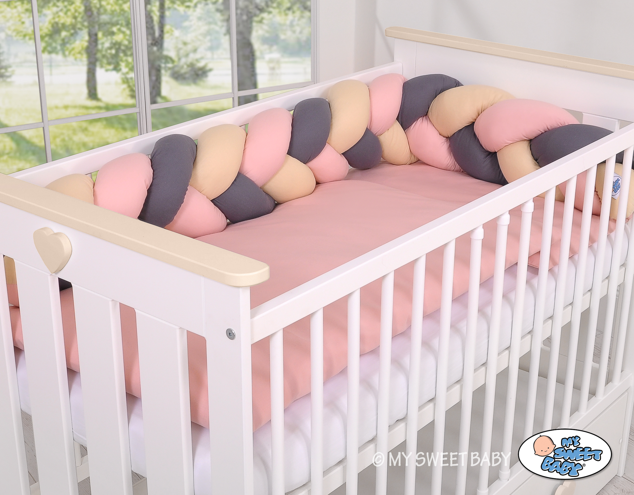 Kleinbaby.nl » Gevlochten Collectie » Gevlochten Bedomrander » Hoofdbeschermer Gevlochten voor Ledikant 180cm Beige Antraciet Stofroze