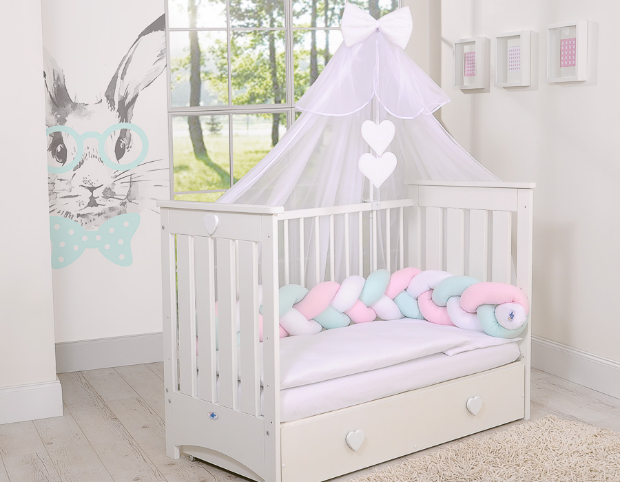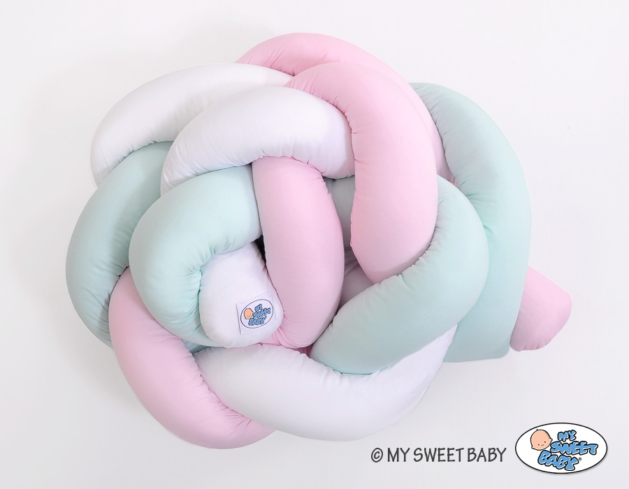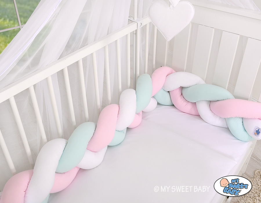 Kleinbaby.nl » Gevlochten Collectie » Gevlochten Bedomrander » Hoofdbeschermer Gevlochten voor Ledikant 180cm Mint Roze Wit
