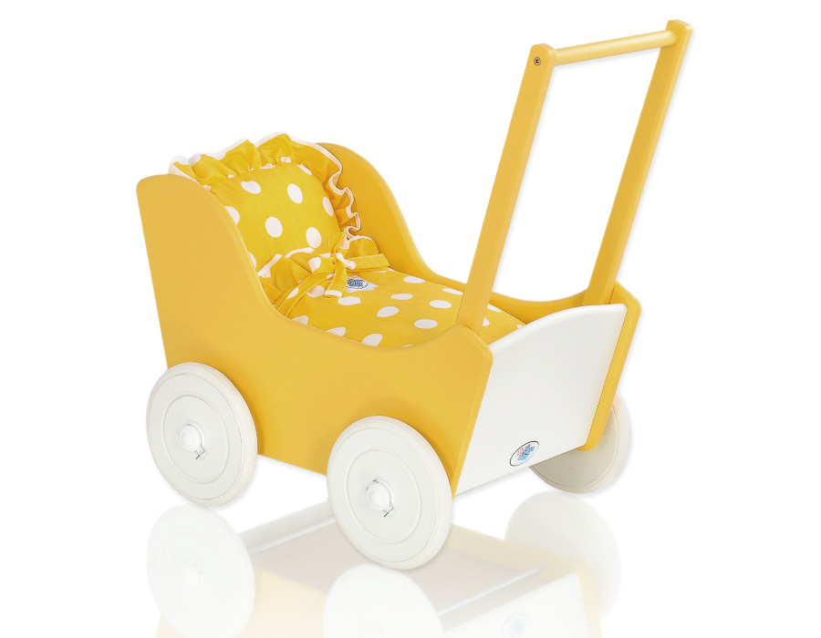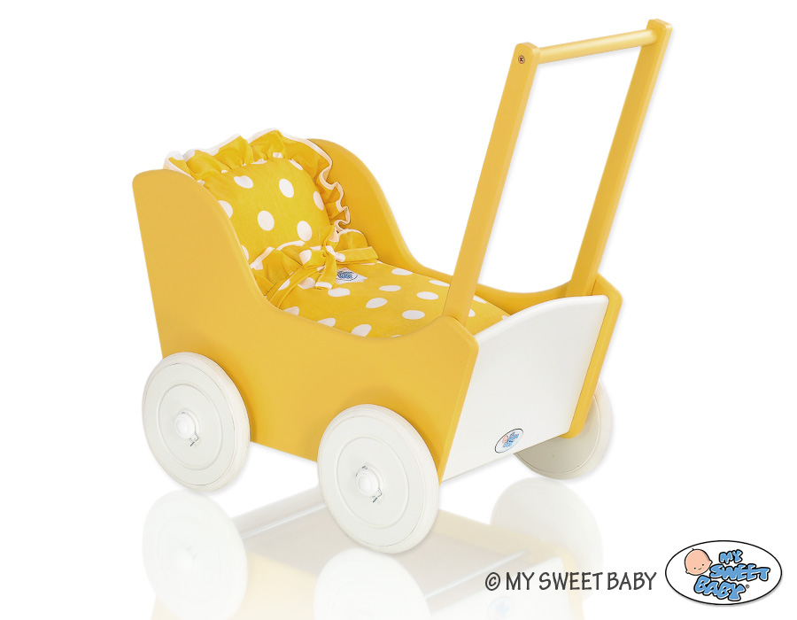 Kleinbaby.nl » Speelgoed Knuffels » Poppenwagens en Speelgoed » Houten Poppenwagen » Poppenwagen van Hout Geel » Houten Poppenwagen met Dekentje Wit Geel
