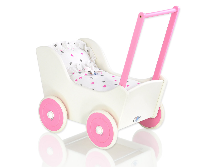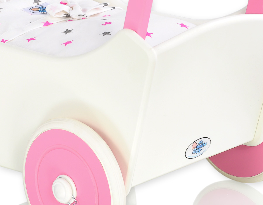Geweldig cadeau voor een kleine meid. De poppenwagen is hét topproduct voor kinderen. Gemaakt van veilige materialen en geverfd met ecologische verf. De wielen zijn met een klikmechanisme gemonteerd op metalen assen, wat ze soepeler doet draaien.