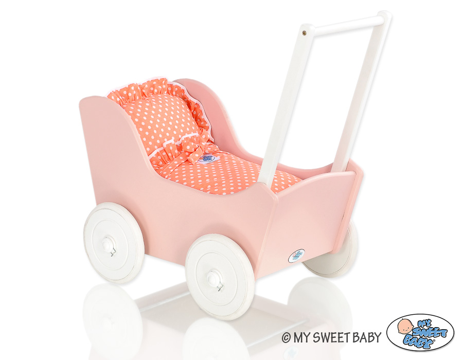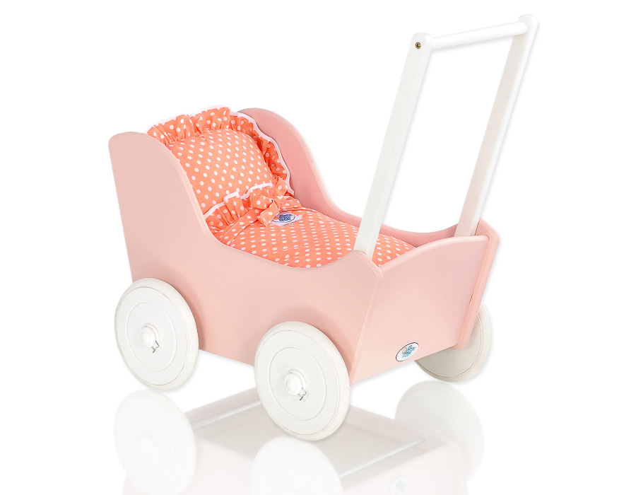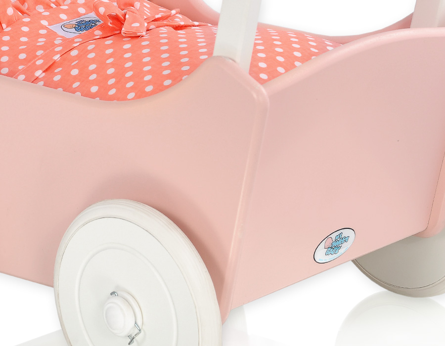 Geweldig cadeau voor een kleine meid. De poppenwagen is hét topproduct voor kinderen. Gemaakt van veilige materialen en geverfd met ecologische verf. De wielen zijn met een klikmechanisme gemonteerd op metalen assen, wat ze soepeler doet draaien.