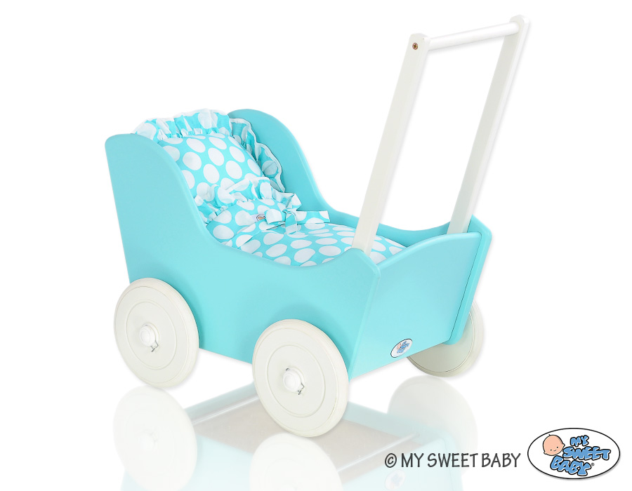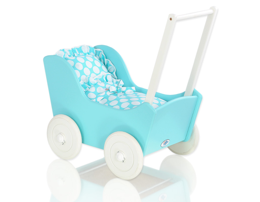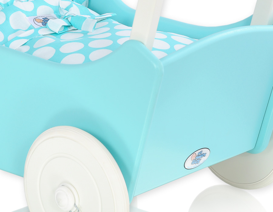 Kleinbaby.nl » Speelgoed Knuffels » Poppenwagens en Speelgoed » Houten Poppenwagen » Houten Poppenwagens Turkoois » Houten Poppenwagen met Dekentje Wit Turkoois