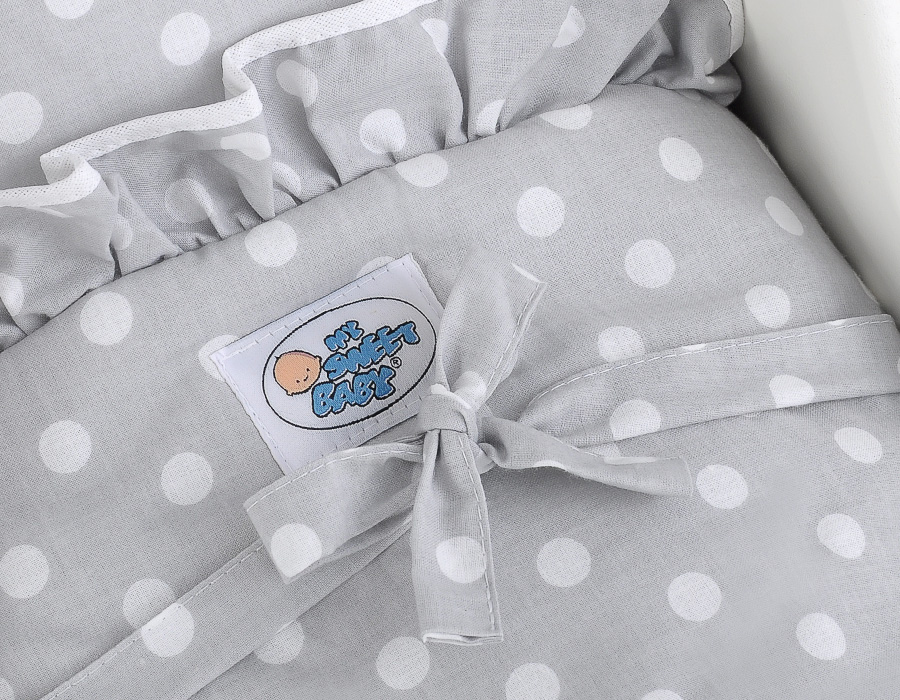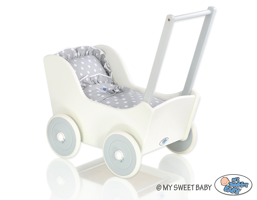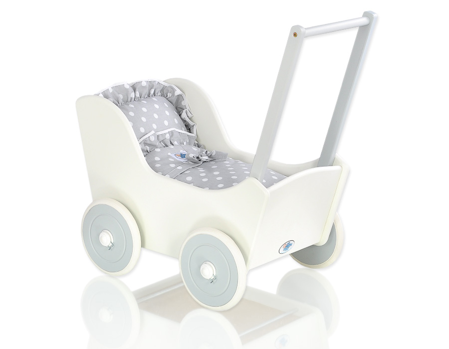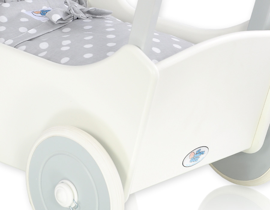 Kleinbaby.nl » Speelgoed Knuffels » Poppenwagens en Speelgoed » Houten Poppenwagen » Houten Poppenwagen Grijs » Houten Poppenwagen Wit Grijs Polkaprikker