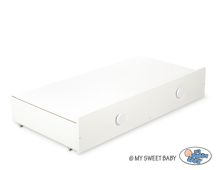 Een lade voor een ledikant van 120x60 cm met decoratieve, handgemaakte handvaten. Biedt meer ruimte voor beddengoed, speelgoed en andere benodigdheden.