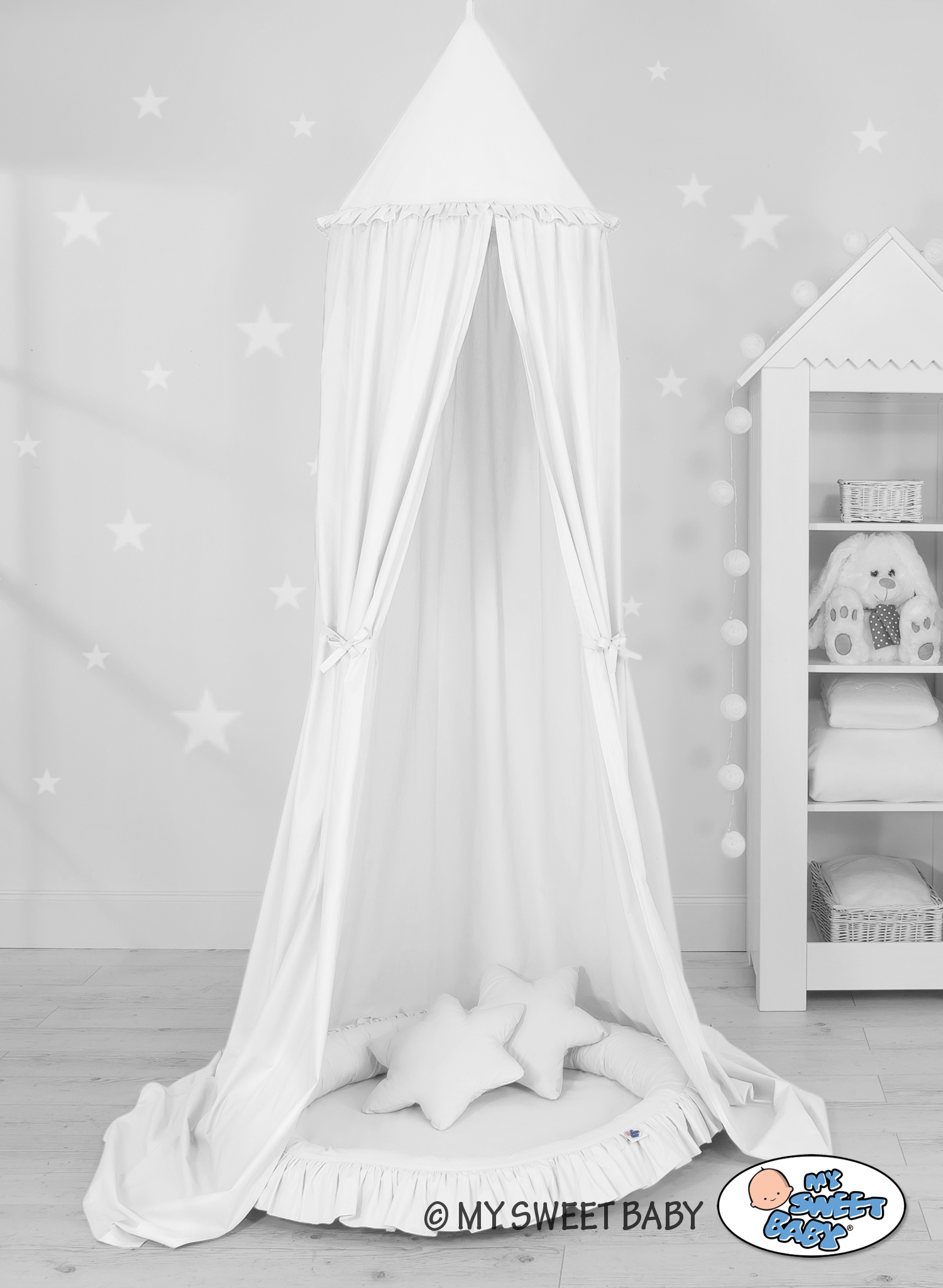 Een lange, hangende luifel van katoen. Een prachtig element in de kinderkamer. Het kan gebruikt worden als unieke decoratie van een ledikant, maar het kan eveneens een prachtige plek vormen om in te spelen. Hang de luifel over het ledikant en bescherm je baby tegen te veel licht en lawaai, het creëert tevens een knusse en veilige plek om in te rusten. De luifel kan gemakkelijk bevestigd worden aan het plafond. De lengte van 260 cm maakt het mogelijk om de uiteinden op de vloer te leggen. Dit creëert een perfecte schuilplaats en speelplek voor oudere kinderen. De luifel is gemaakt van Oekotex-gecertificeerd 100% katoen. Aan de zijkanten zitten praktische linten om de luifel vast te binden en er een prachtige tent van te maken. De rand aan de bovenkant kan worden verwijderd. De stof kan gewassen worden op 30 graden. In combinatie met het prachtige nest wordt het een perfecte plaats om plezier te maken. De zachte randen bieden een veilige omgeving voor de baby. De rand is gevuld met een gecertificeerde, niet-allergene vulling van Eco Fillball-vezels. Deze is zacht, donzig en zorgt voor een goede luchtcirculatie. De bodem van het babynest is gemaakt van een modern, anti-allergie, gecertificeerd materiaal. De bodem kan afgenomen en gewassen worden op 30 graden.